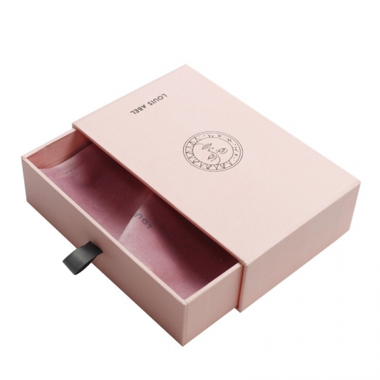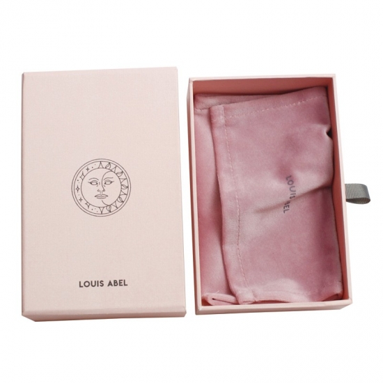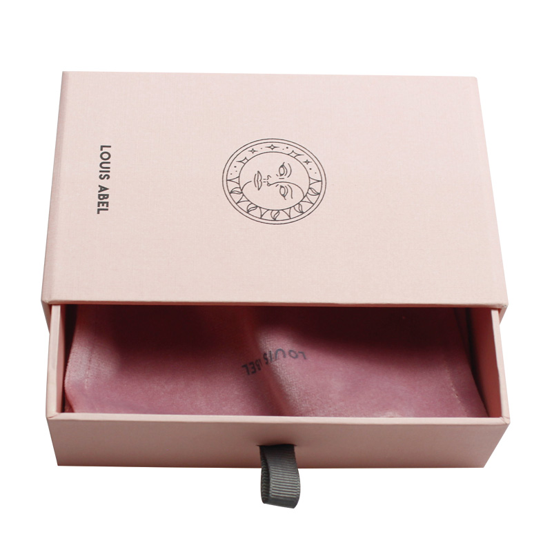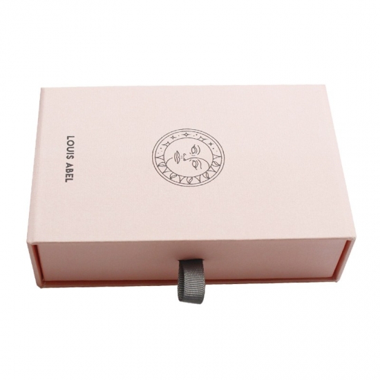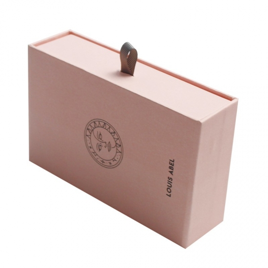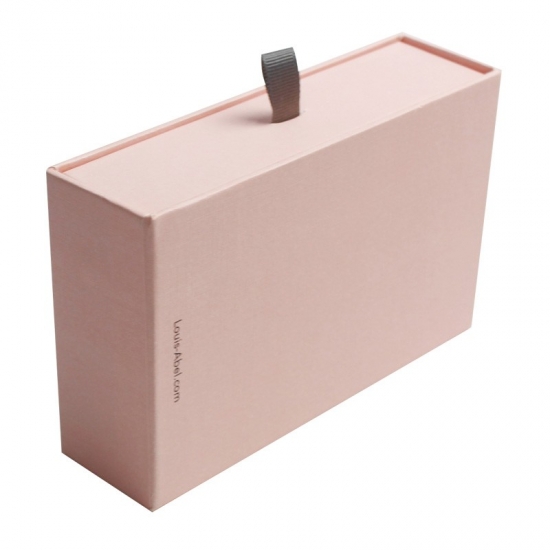 Het is een sieraden schuifdoos in warme verkoopstijl wat maakte door roze kleur speciaal papier + 1200g grijs karton vol met roze opdruk op de voor- en achterkant met logo en tekst, de opdruk aan de buitenkant past bij het speciale textuurpatroon op de doos.