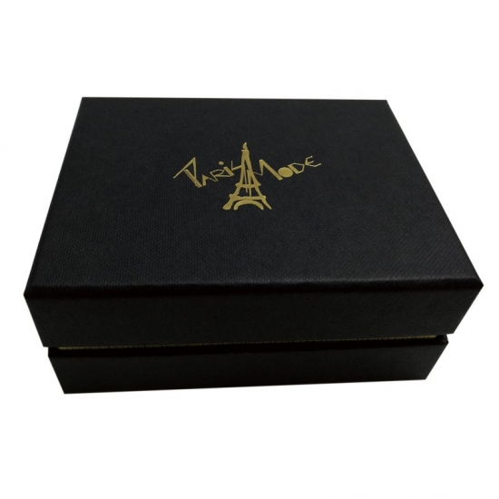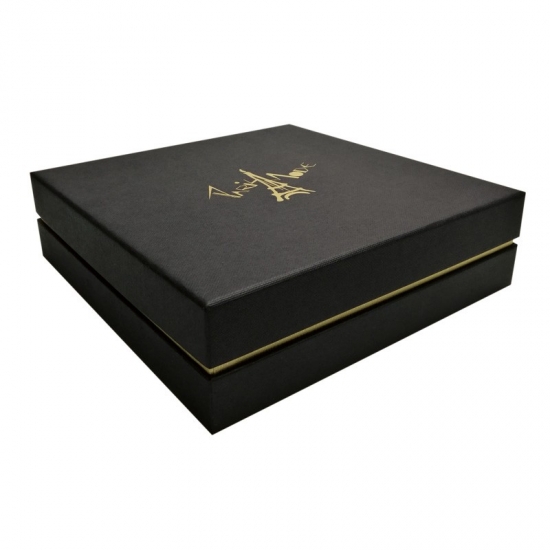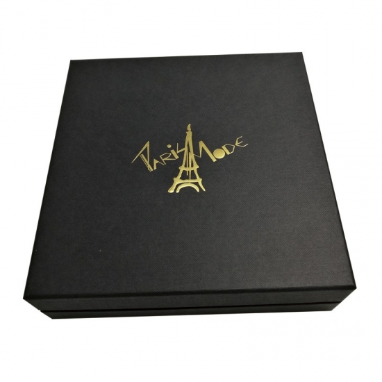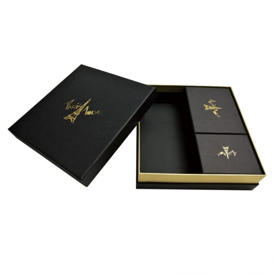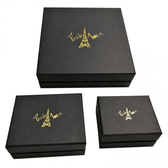 Dit is een set van een luxe zwarte grote stevige doos met een kleine doos, een geschenkdeksel en een bodemdoos, elke doos is gemaakt van speciaal zwart papier + 1200g grijskarton en het logo is in goudfolie op de bovenste deksels.