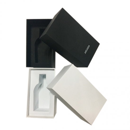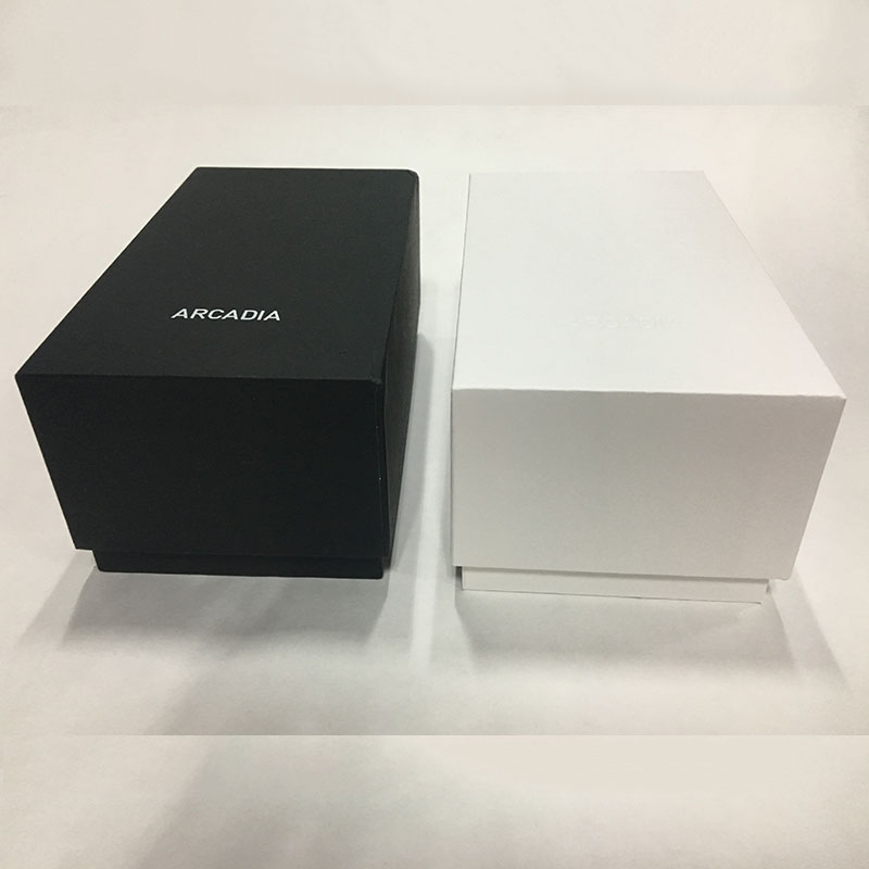 Dit is een geschenkdozen met deksels wat maakte van 157g C2S-kunstdrukpapier + 1200g grijs karton, witte kleur met mat laminaat, en zwarte kleur met witte foliedruk op het deksel.