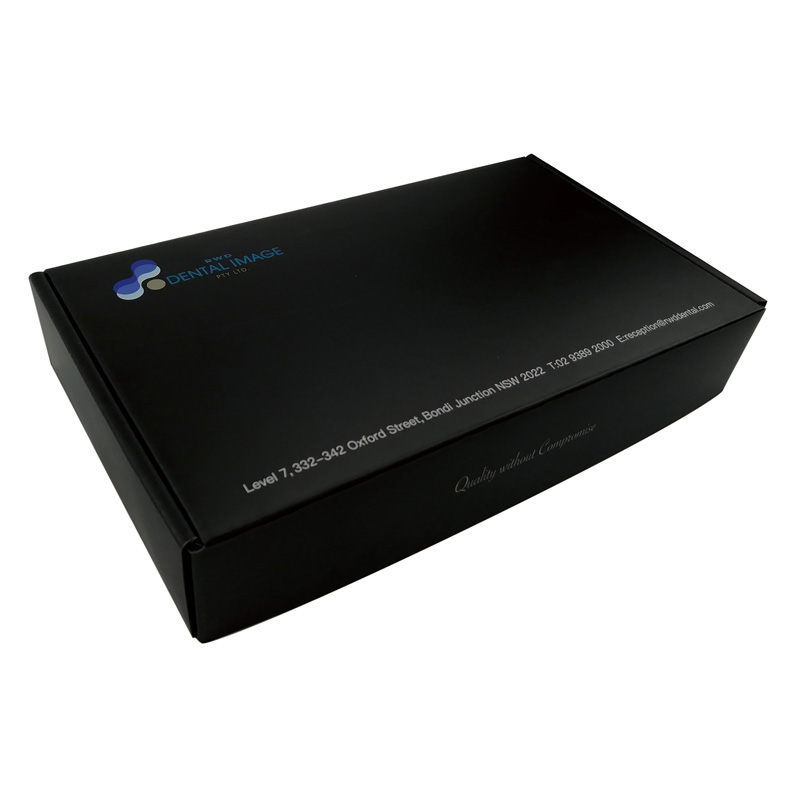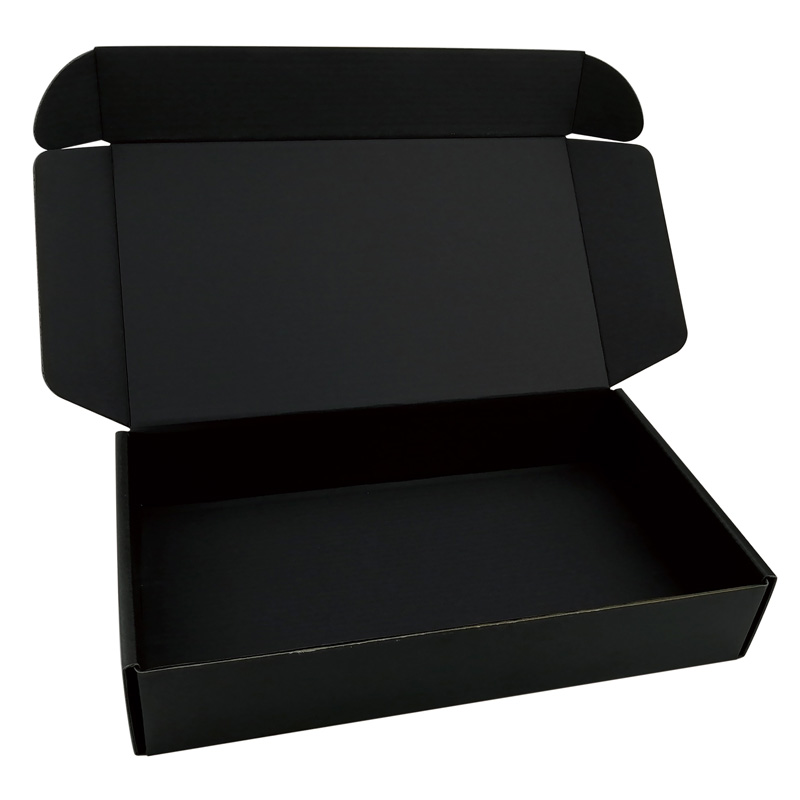 Dit is een zwarte golfkartonnen verpakking dozen Deze verzenddoos is gemaakt van 250g CCNB+BE flute+zwart papier. Het is een eenvoudig type verzenddoos met een zwarte binnen- en buitenkant en een aangepaste logo-opdruk op de buitenkant van de doos met een matte afwerking.