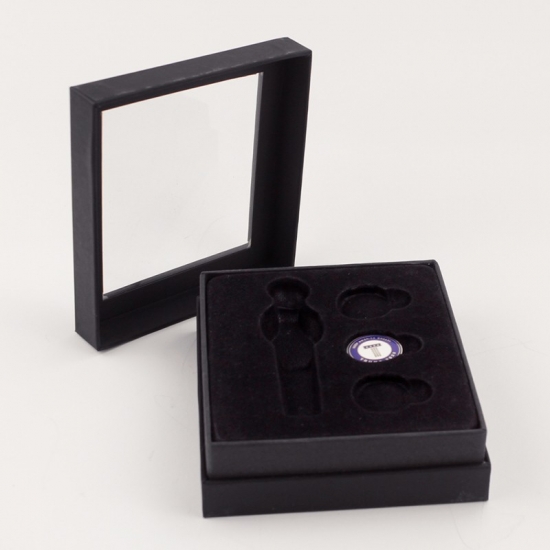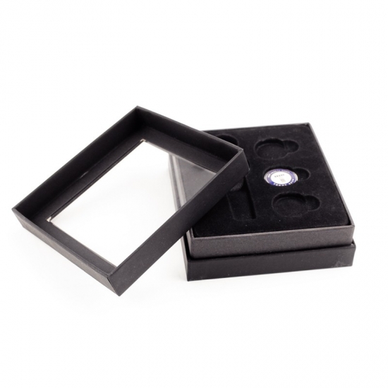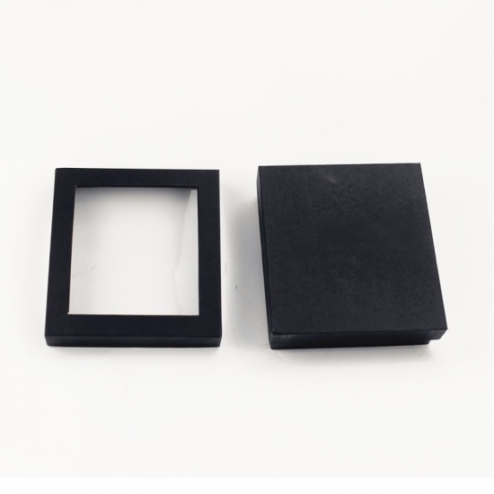 Dit is een op maat gemaakte zwarte decoratieve nestbare kartonnen doos met een transparant PVC-deksel, gemaakt van zwart speciaal papier + 2 mm grijs karton. Binnenin zit zwarte fluwelen stof die de blisterverpakking bedekt, waardoor het er zeer hoogwaardig en luxueus uitziet.