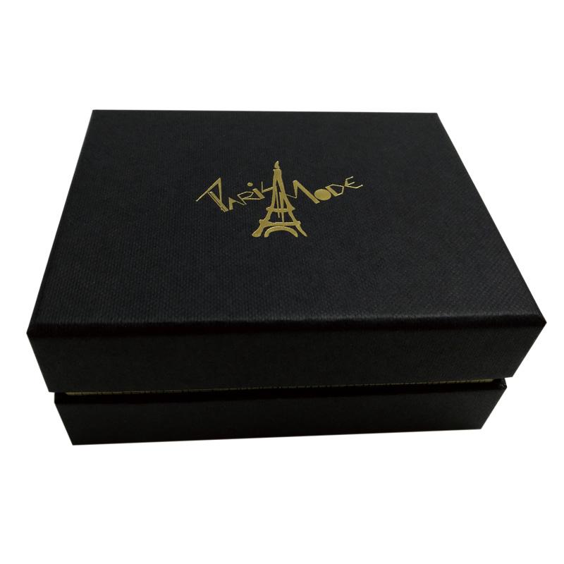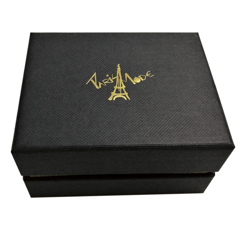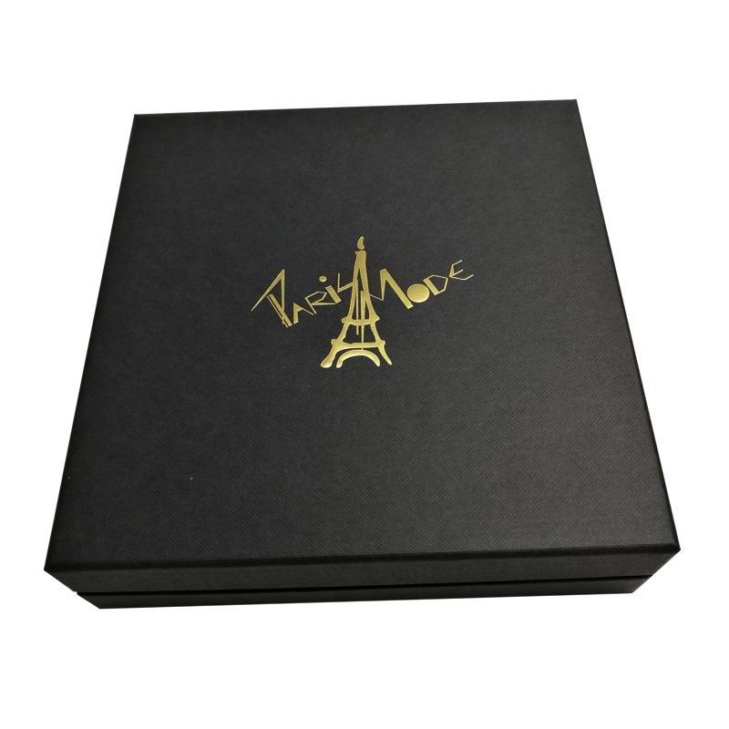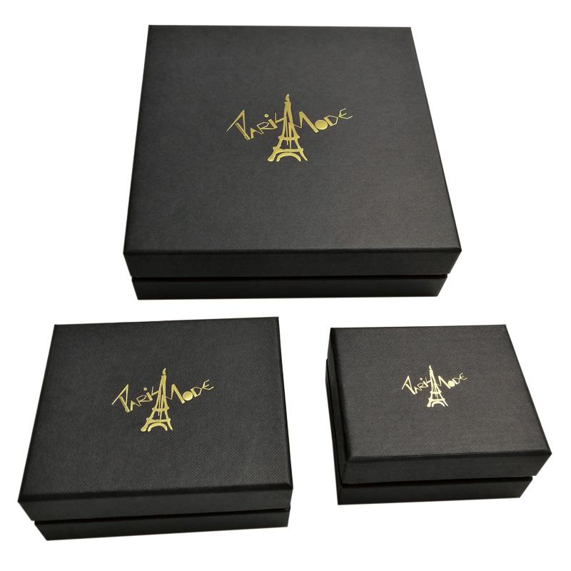 Dit is een luxe set zwarte deksel en bodemdoos wat maakte van speciaal structuurpapier + 1200g grijs karton, de rand van de basis is gemaakt van goudkleurig speciaal papier en het logo bovenop de doos is voorzien van gouden foliedruk. Er is één grote doos voor 3 kleinere dozen van verschillende formaten.