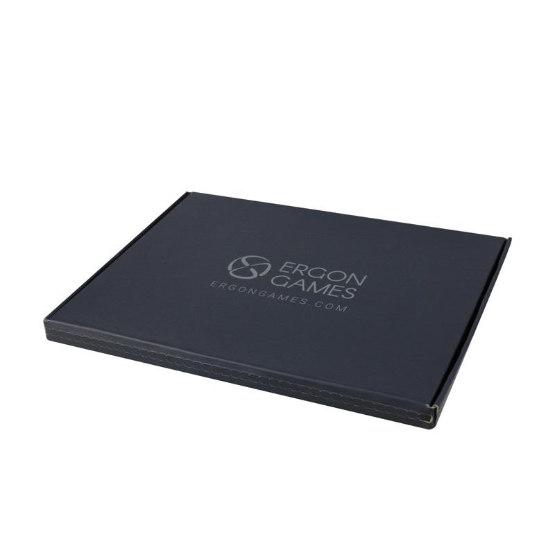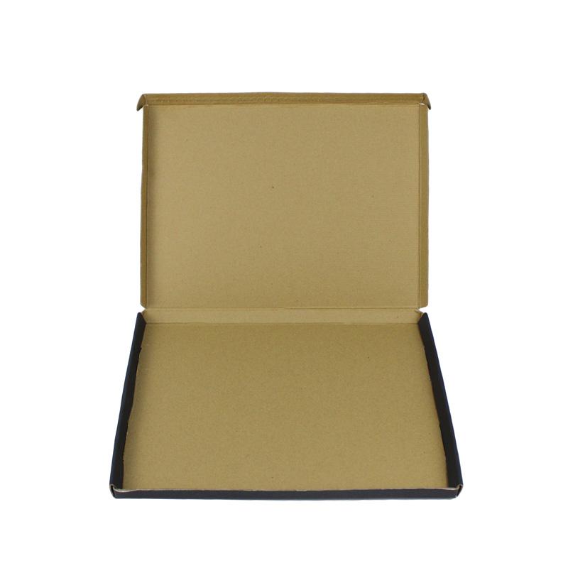 afwerking van de doos: Buitenkant volledig zwart bedrukt met grijs logo, matte laminering; binnenkant effen bruin kraftpapier. Met perforatie aan de sluitzijde, voor eenvoudig openen voor klanten bij ontvangst van de productverpakking.