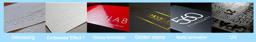 Er zijn matte/glanzende laminaatsoorten, foliedruk, reliëfdruk, UV-druk, enz.