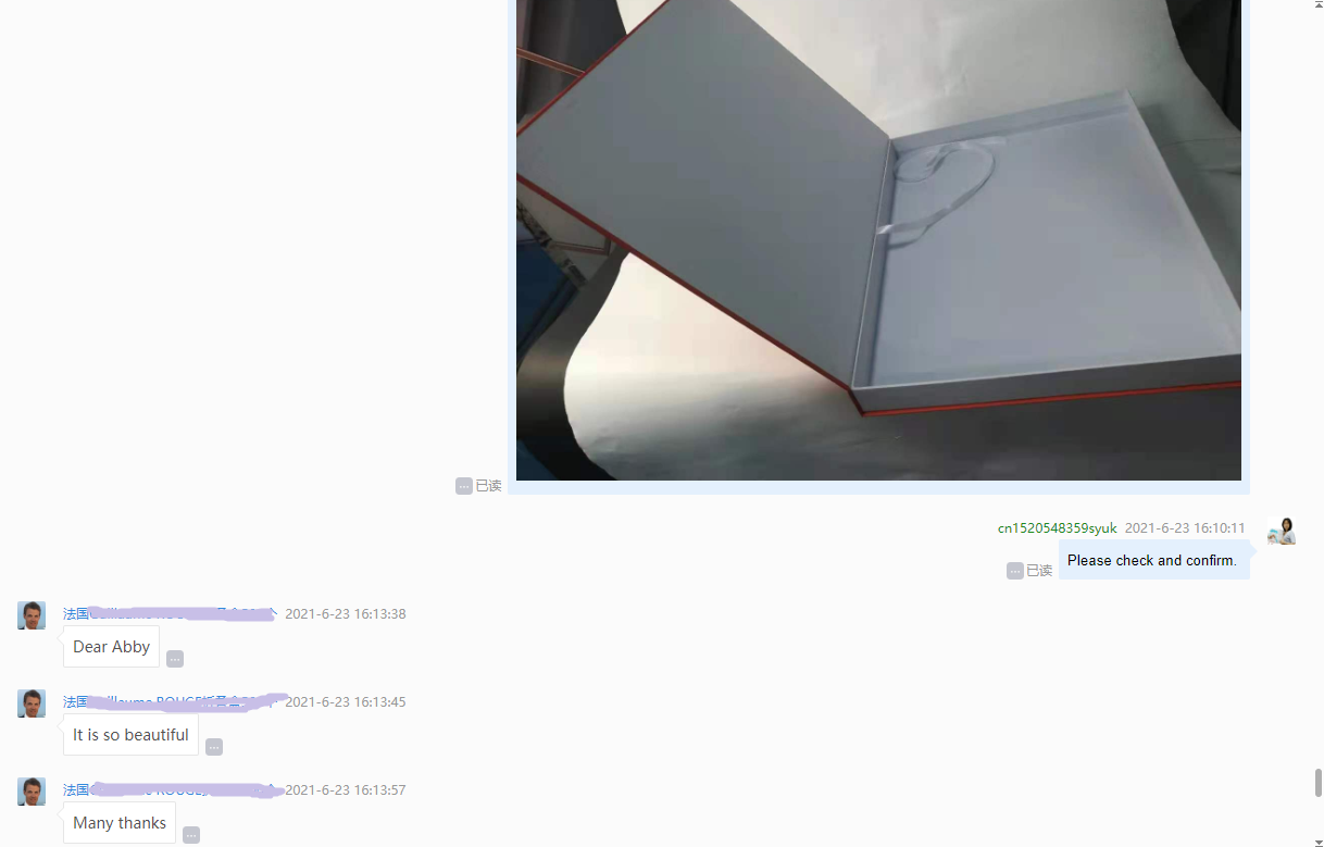 Uiteindelijk ging hij akkoord met ons idee. Nadat we het ontwerp met hem hadden besproken, was het proefmonster van de doos binnen 3 dagen klaar. We hebben foto's en video's gestuurd ter referentie. Hij was er erg blij mee.