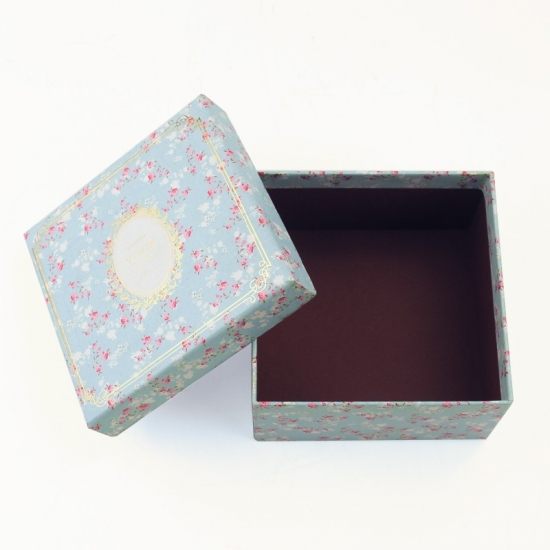 Dit is een op maat gemaakte romantische geschenkdoos met een blauw vierkant bloemenpatroon, deksel en bodem, gemaakt van 157g C2S-kunstpapier + 1200g grijs karton, LOGO gouden folie-heetgestempeld, aan de binnenkant effen rode decoratieve kleur. Afmetingen: 12x12x12 cm.