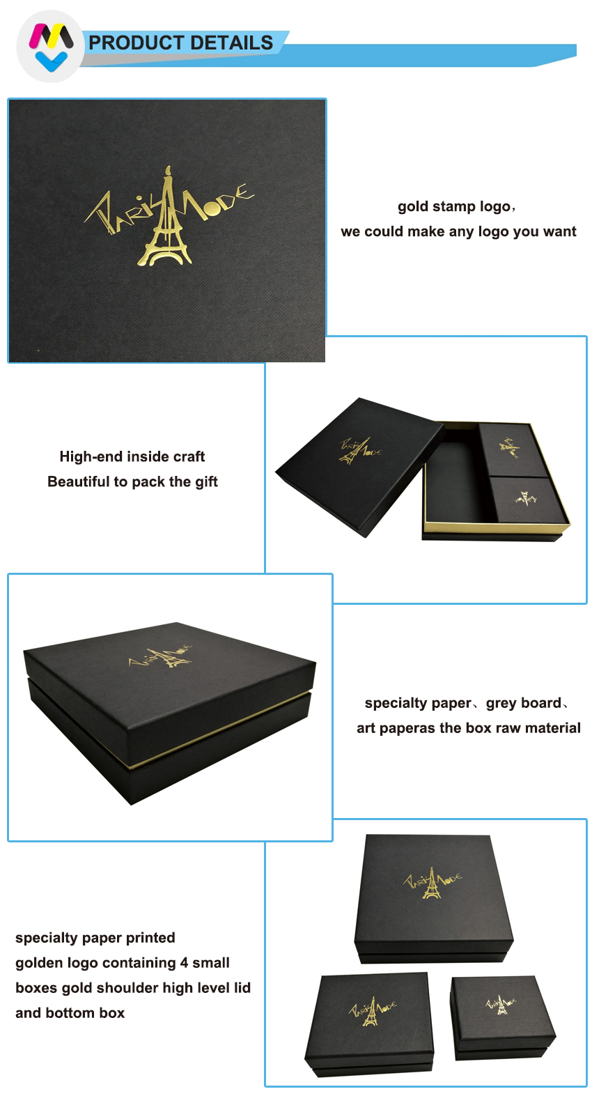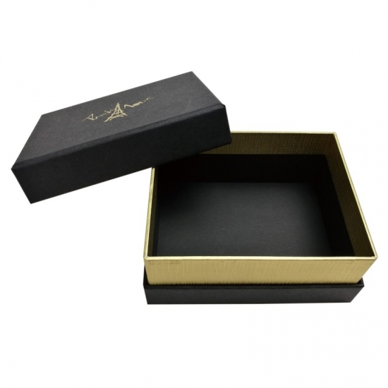 Aangepaste set van één doos in een kleine doos aan de binnenkant met gouden manchetdeksel en bodemdoos, gemaakt van zwart speciaal papier + 1200g grijs karton, LOGO gouden foliedruk past goed bij de gouden manchetkleur.Gebruik: Alle soorten producten en geschenkverpakkingen, parfum, sieraden, cosmetica, kleding, enz.