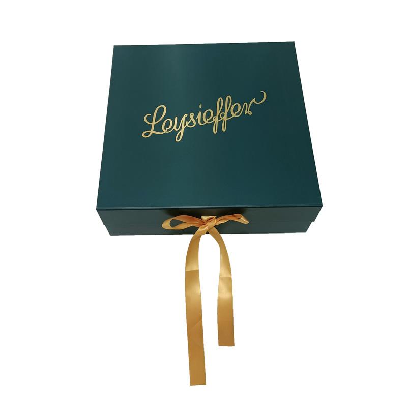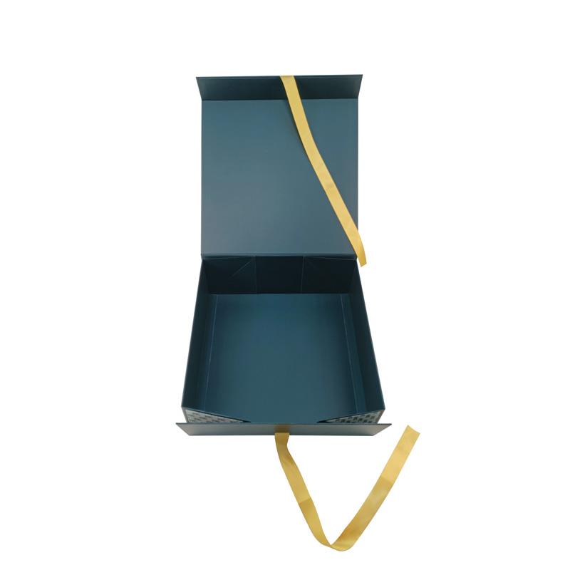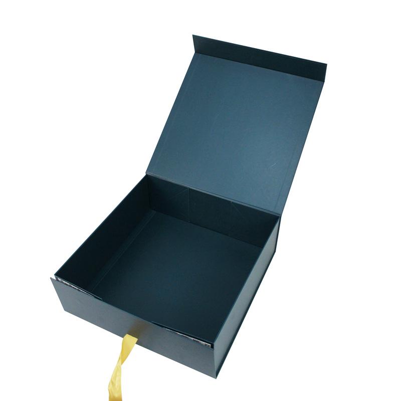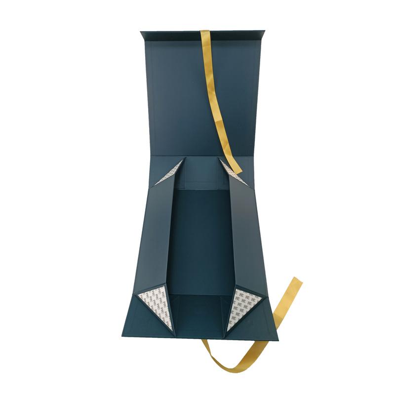 Luxe Magnetische opvouwbare papieren doos Gemaakt van 157 grams kunstdrukpapier gelamineerd met stevig karton, met een donkerblauwe Pantone-kleur over de hele doos bedrukt en een eigen logo in Pantone Gold. Zowel magnetisch als met lint om de doos te sluiten, met 3M-plakband op de vier hoeken om de doos in vorm te houden. Het wordt veel gebruikt voor het verpakken van schoenen en andere producten. boetiek geschenkverpakkingen .