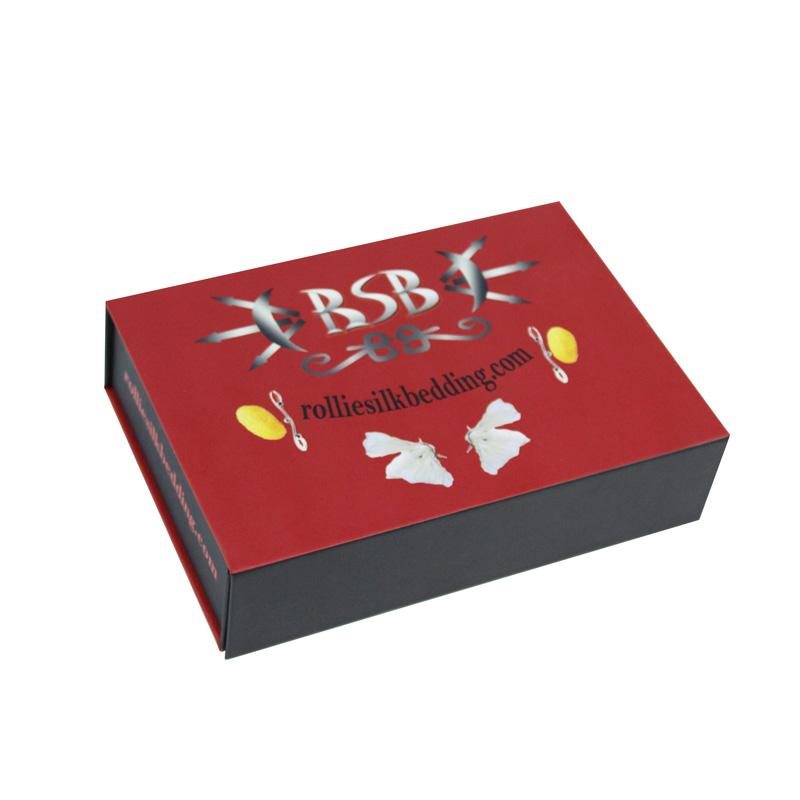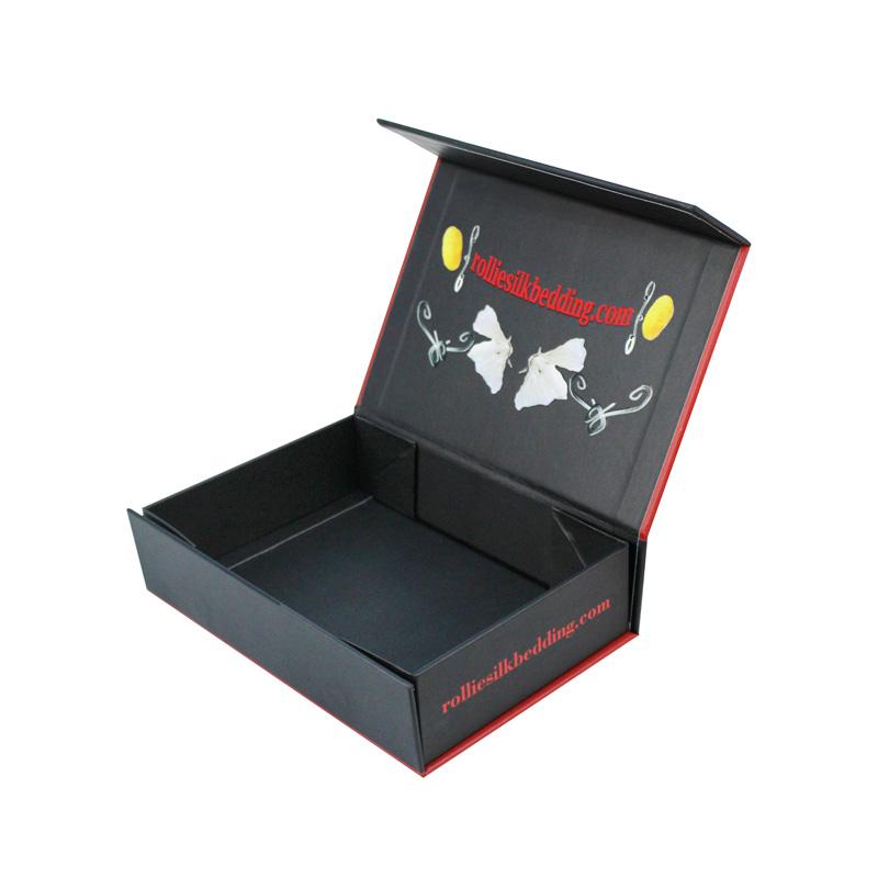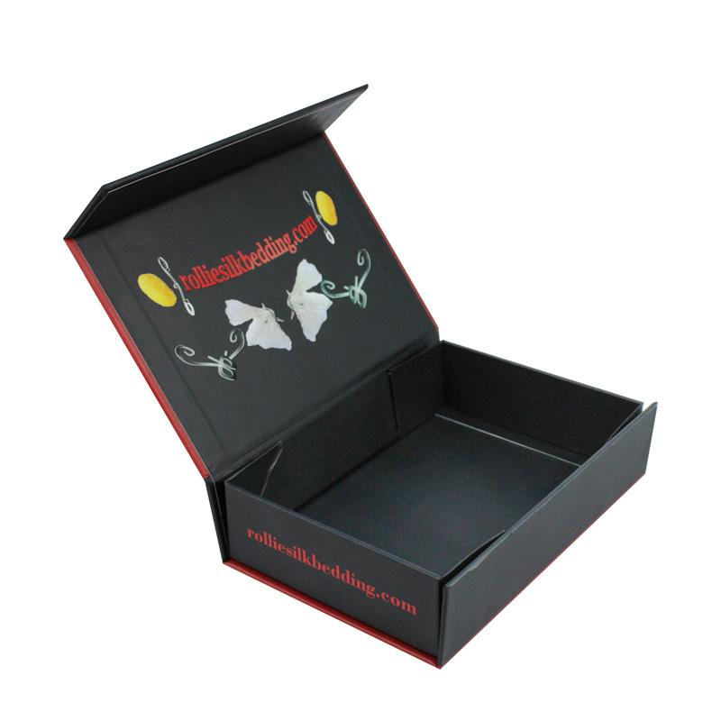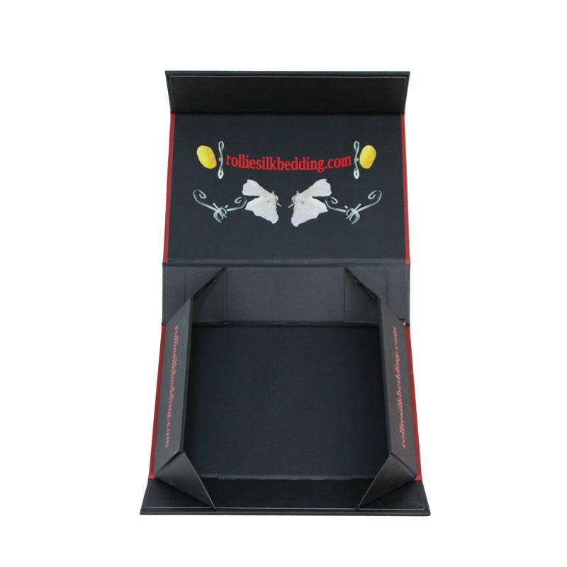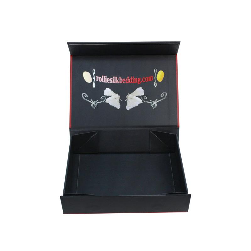 Premie Opvouwbare stijve dozen Gemaakt van 157 grams kunstdrukpapier, gelamineerd met 2 mm grijs chipboard. Met volledig zwarte achtergrond en gepersonaliseerde CMYK-logoprint op de buiten- en binnenkant van het deksel. Speciale behandeling met spot-UV-coating zorgt ervoor dat het merk opvalt bij klanten.
