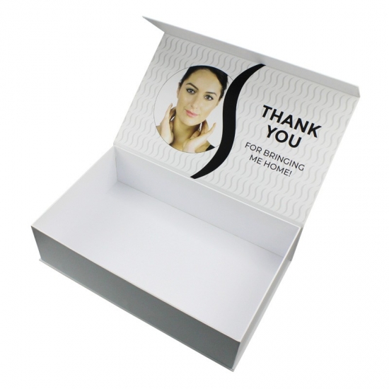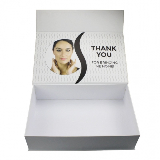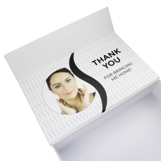 De grote magnetische cosmetische geschenkdoos is gemaakt van 157 g/m² C2S-kunstdrukpapier, gelamineerd met 2,5 mm grijs karton, op maat gemaakt in elke gewenste kleur en met een persoonlijk logo. De oppervlakteafwerking is mat gelamineerd en de afmetingen zijn 53,5 * 33 * 14 cm.