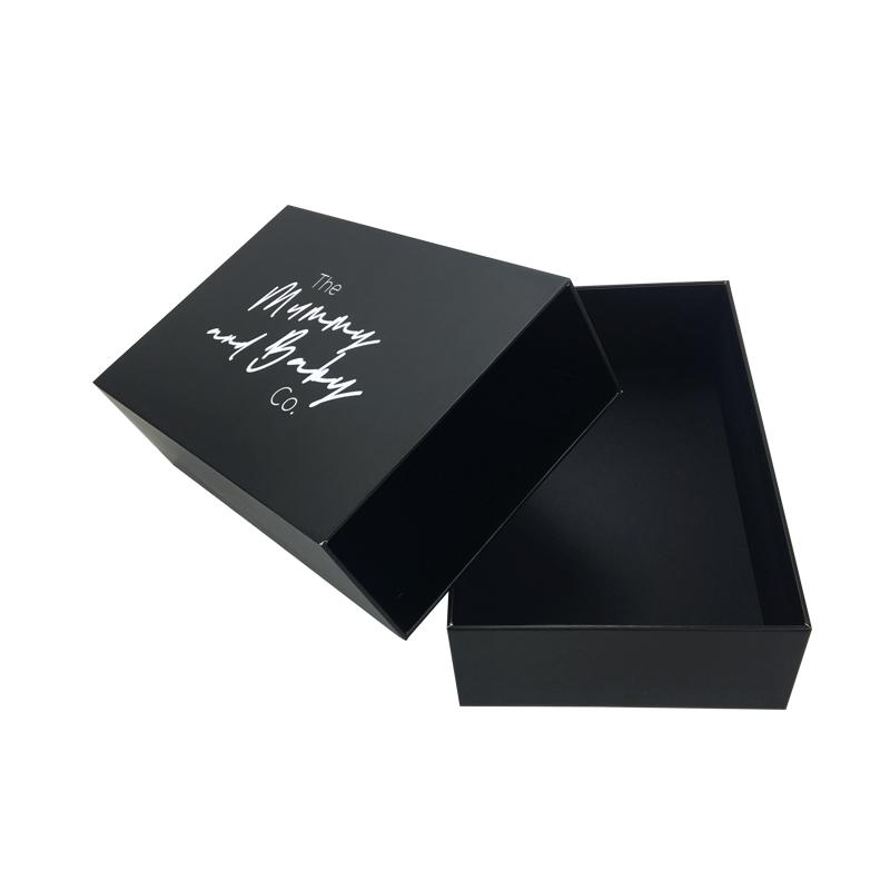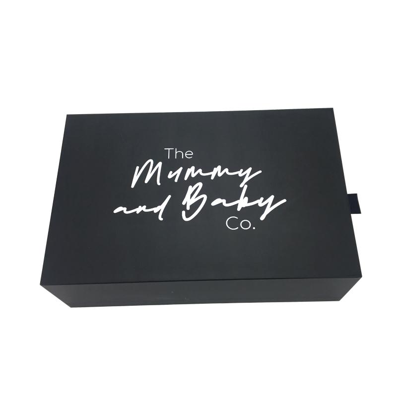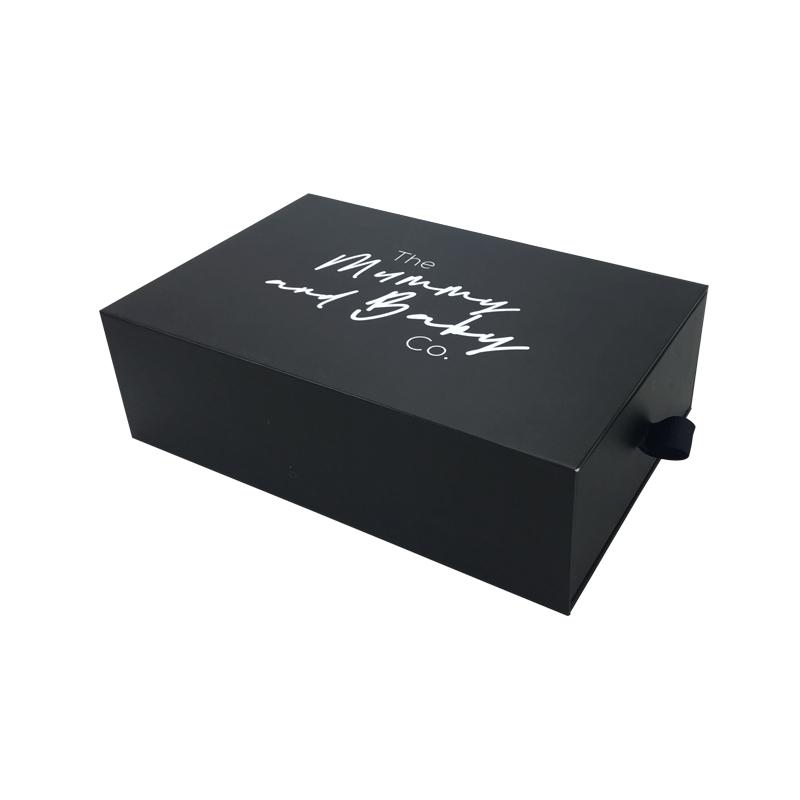 afwerking van de doos: CMYK F Volledige zwarte bedrukking over de hele doos met wit logo, matte filmlaminering ter bescherming, zwarte linttrekker