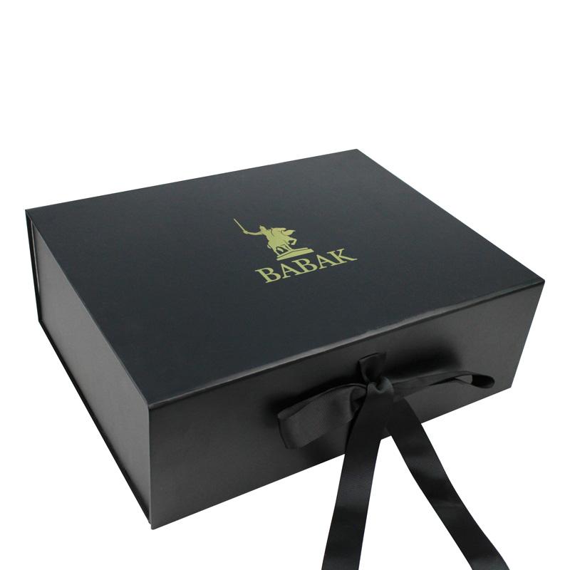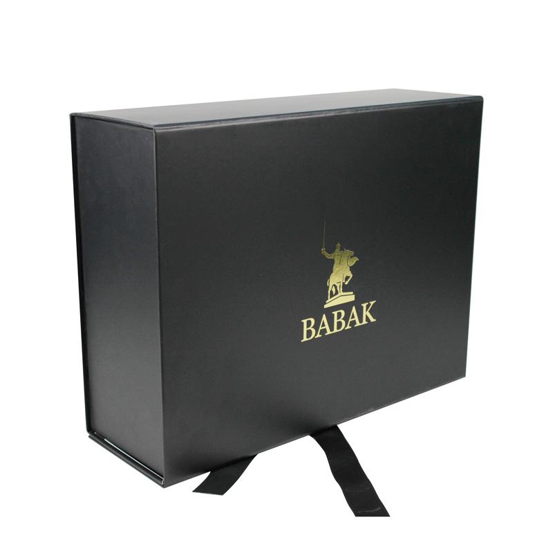 Op maat gemaakte logo goudfolie hete stempel magnetische opvouwbare stoffen doos met lint