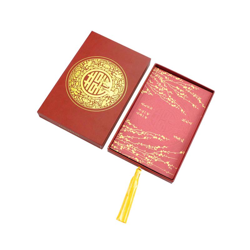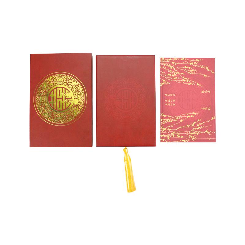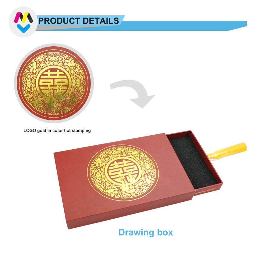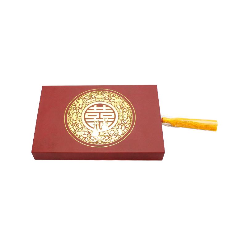 Chinese groothandel hoge kwaliteit uitschuifbare doos, met Chinese bruiloftsontwerpelementen. Vooral het gele lint kan gemakkelijk worden versierd en geopend
