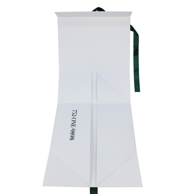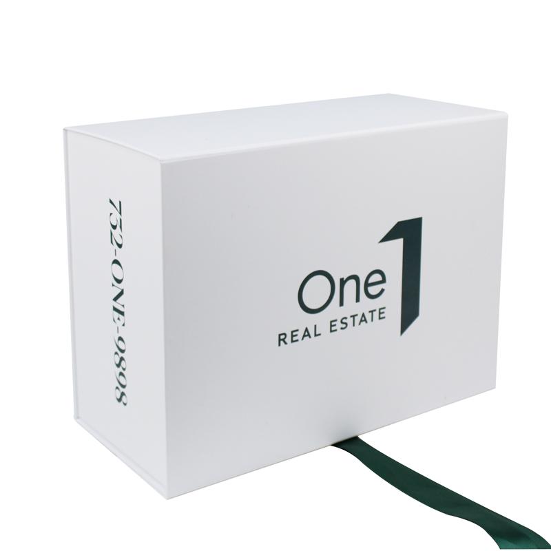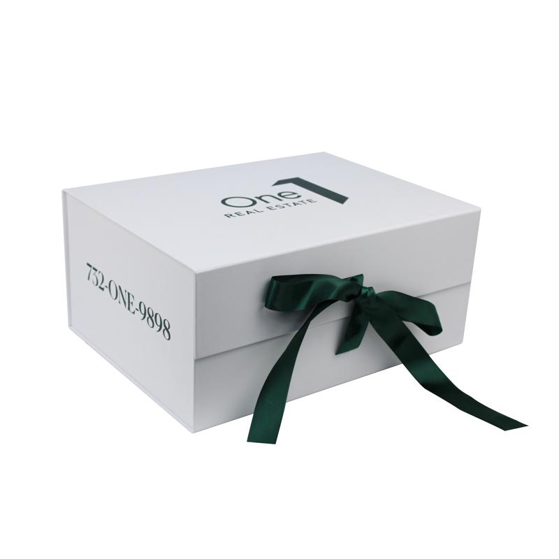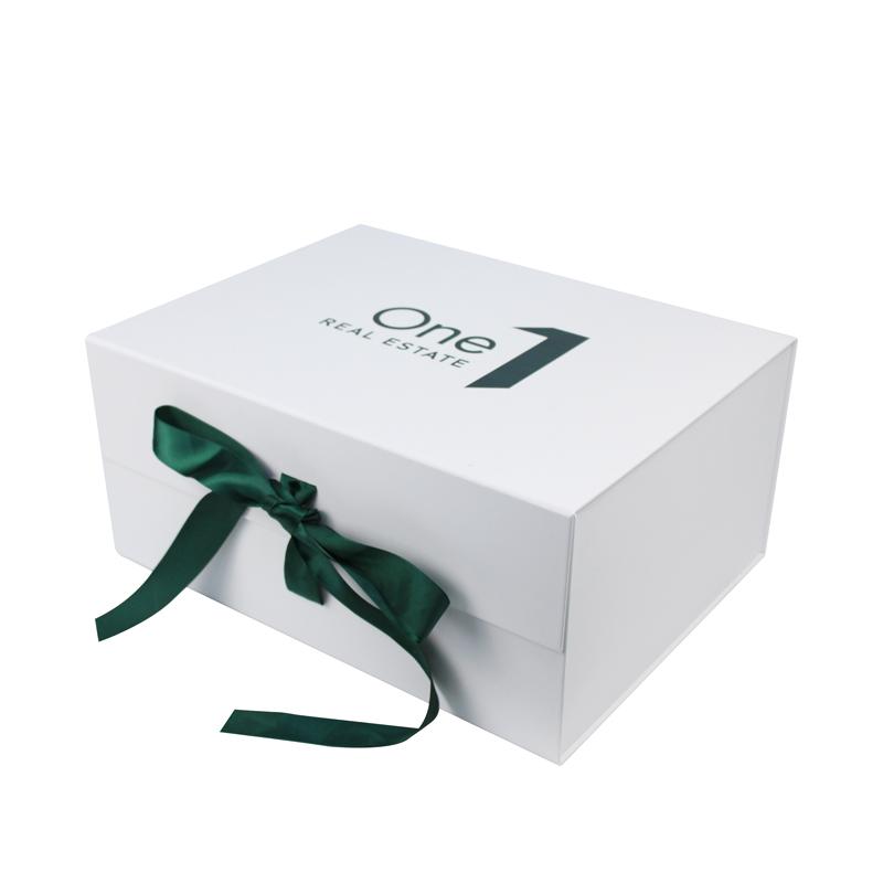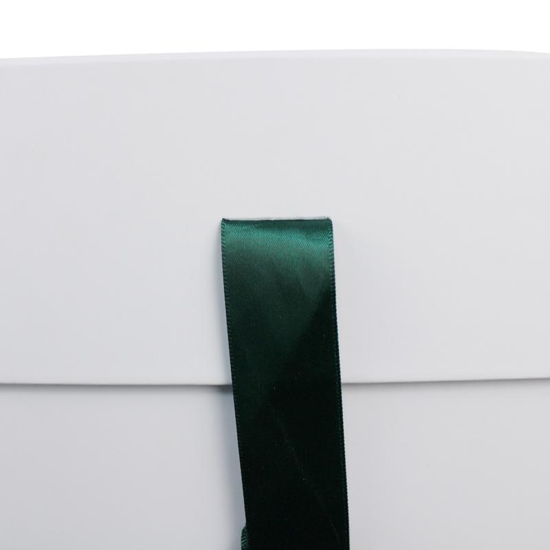 Klassiek witte geschenkdoos met lint Gemaakt van hoogwaardig kunstdrukpapier, gemonteerd op 1400gsm stevig karton, met aangepast logo bedrukt in Pantone-groen, met lint in dezelfde Pantone-kleur.