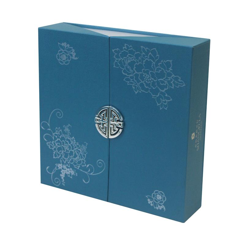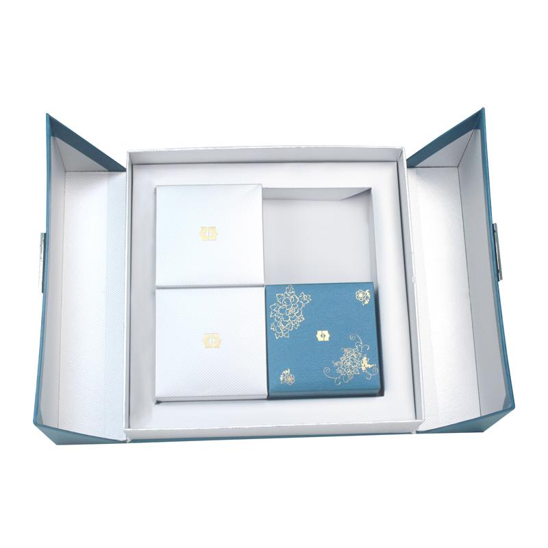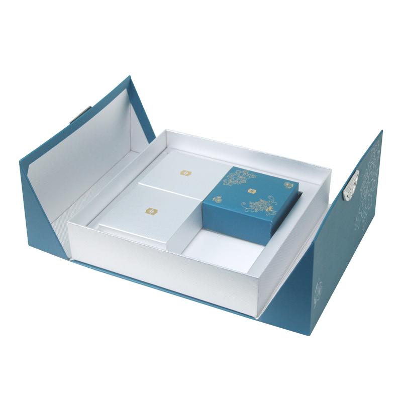 afwerking van de doos: Pantone blauw bedrukt, matte film laminering, reliëfdruk, goudfolie warmdruk,