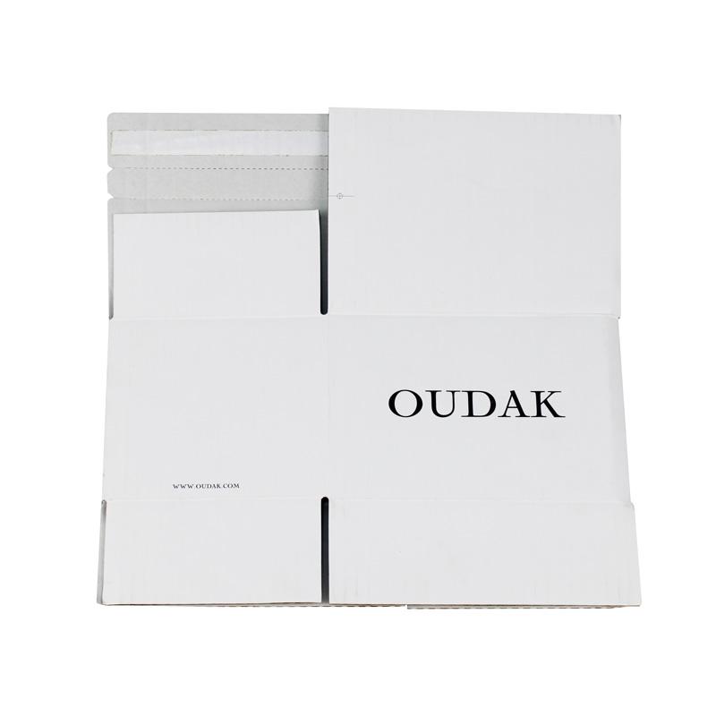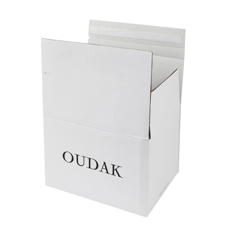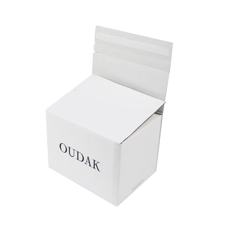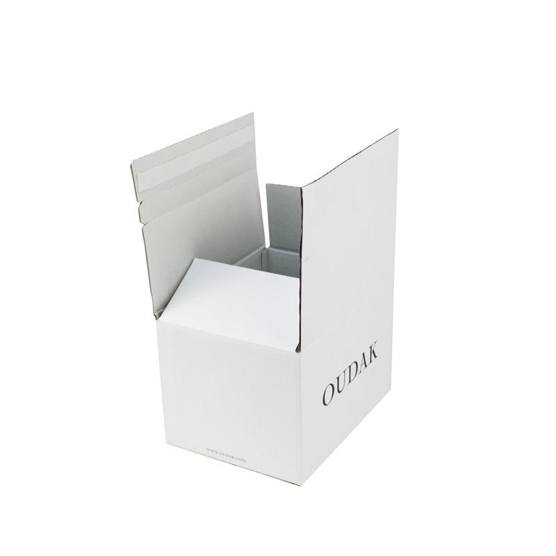 Modieus Easy Seal verzenddozen Gemaakt van 300 g/m² CCNB gelamineerd met 3-laags wit golfkarton. Aan de buitenkant bedrukt met een zwart logo en een matte afwerking. Binnenin een effen witte doos, voorzien van dubbelzijdige tape. De doos is afsluitbaar met zelfklevende tape en kan gemakkelijk worden geopend met een perforatielijn.