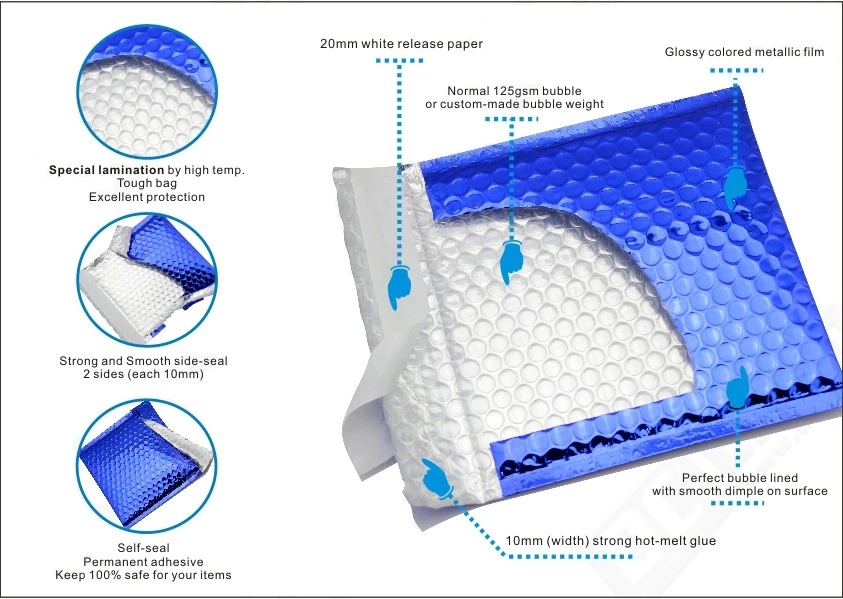 Het materiaal van het product: gealuminiseerde folie + polyethyleen bubbel. De kleur van de gealuminiseerde folie kan worden aangepast, evenals de bedrukking.