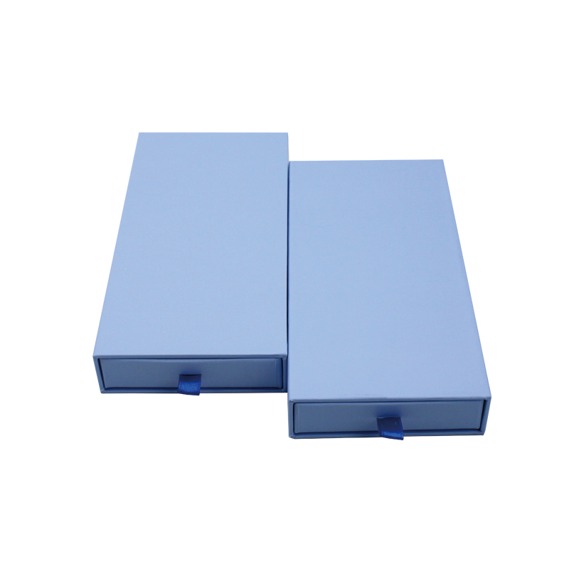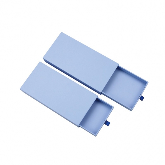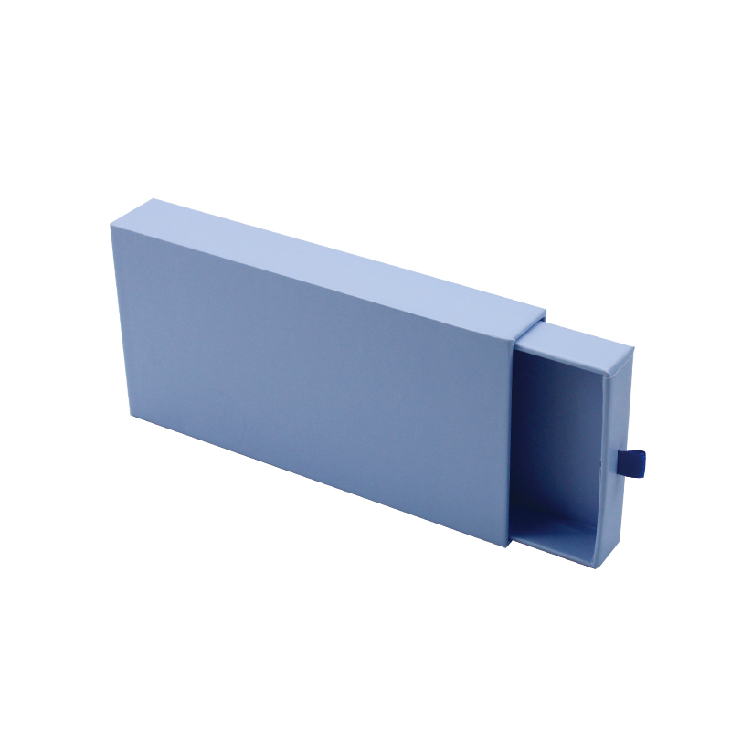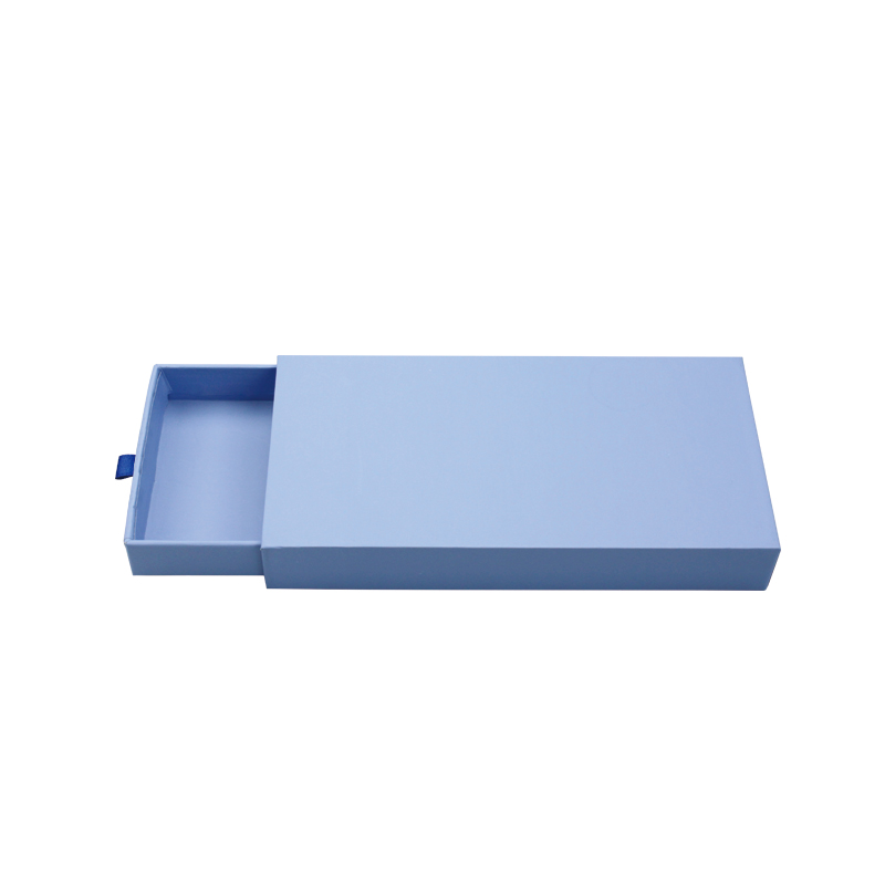 Het is een blauw glijden D lade doos met linttrekker wat maakte door 157g C2S kunstpapier + 1200g grijs karton De hele doos is bedrukt met blauwe, effen kleuren, zonder enig patroon.
