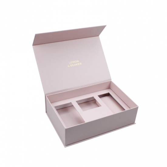 De decoratieve roze magnetische geschenkdoos is gemaakt van 157 g/m² C2S-kunstdrukpapier, gelamineerd met 2 mm grijs karton. De binnenbak is een papieren lade, matte laminering en roze kleur met hete stempels.