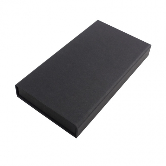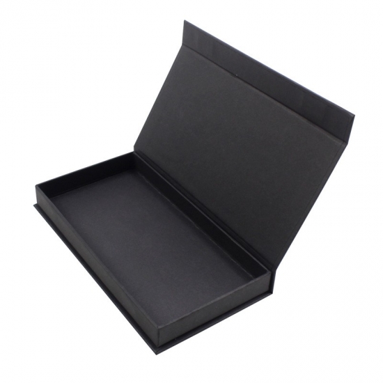 Klein zwart magnetisch geschenkdoosje gemaakt van 157gsm C2S kunstdrukpapier gelamineerd met 1,5 mm grijs karton. Het is een zeer magnetische geschenkdoos met zwarte opdruk en matte laminering.