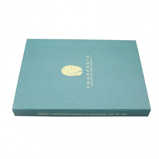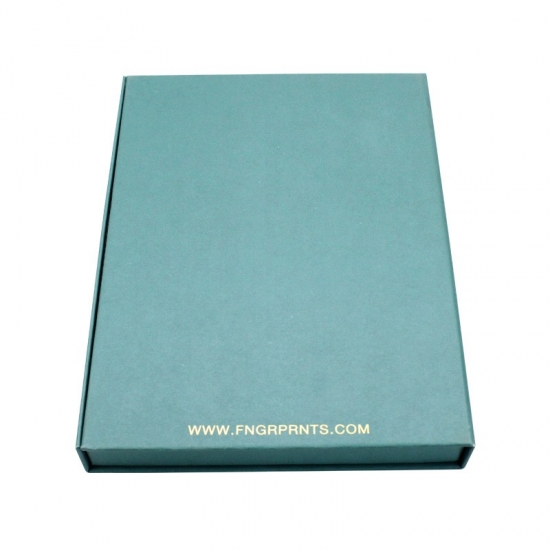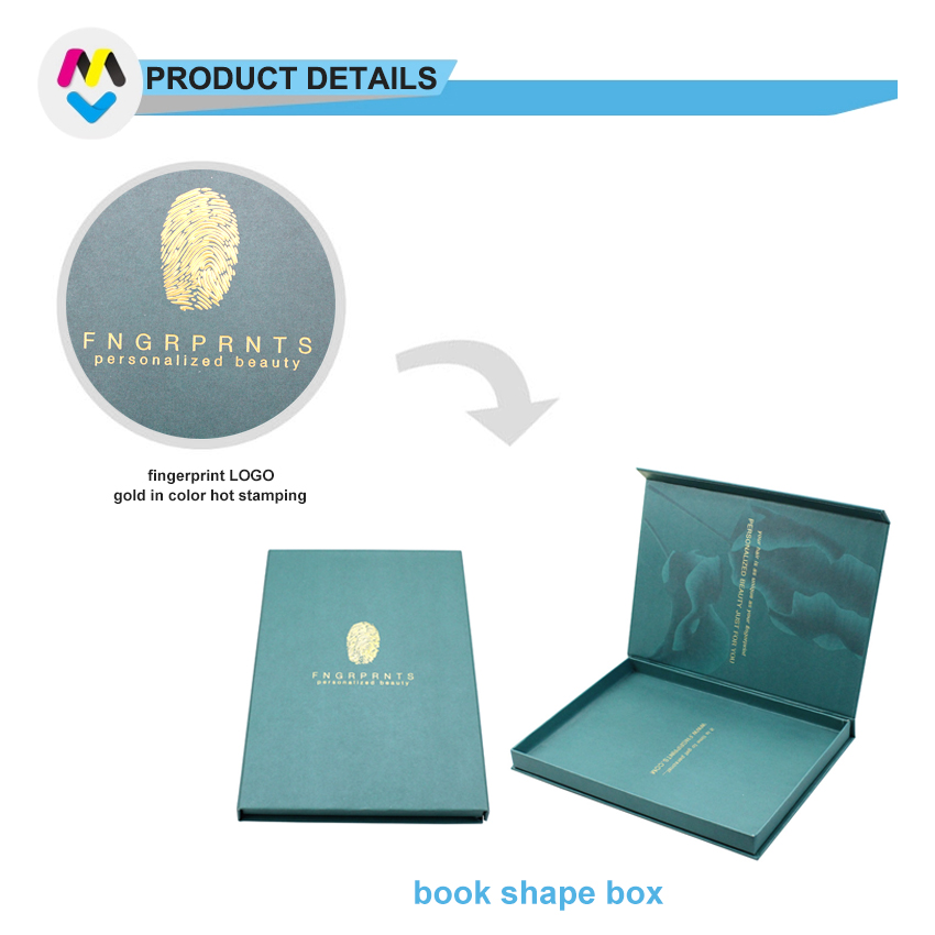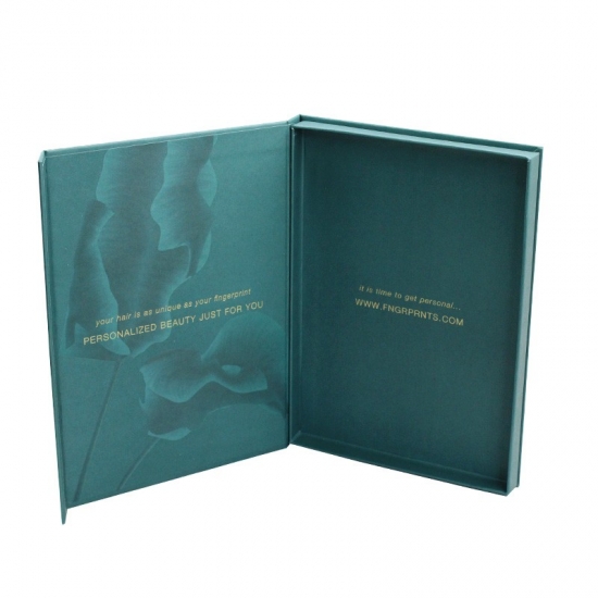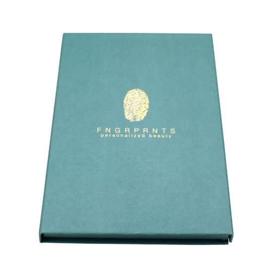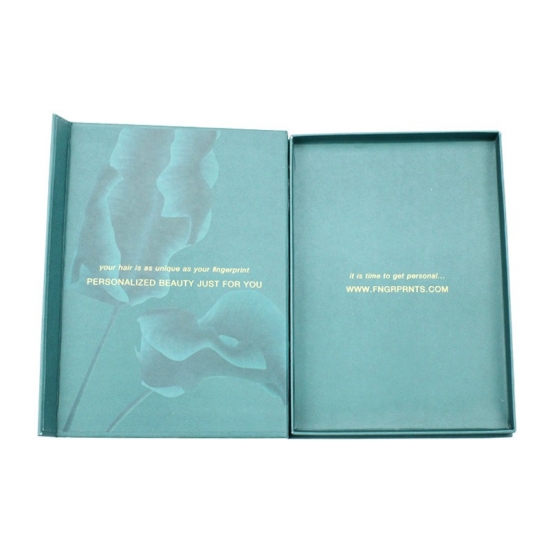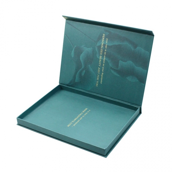 Groene magnetische kartonnen doos is gemaakt van 157 g/m² C2S-kunstpapier gelamineerd met 2 mm grijs karton. Ondersteuning aangepast aan elke maat, elke kleur en elk logo, oppervlakteafwerking was mat lamineren, goudkleurige CMYK-bedrukking. Grootte 22,3 * 16 * 2 cm.