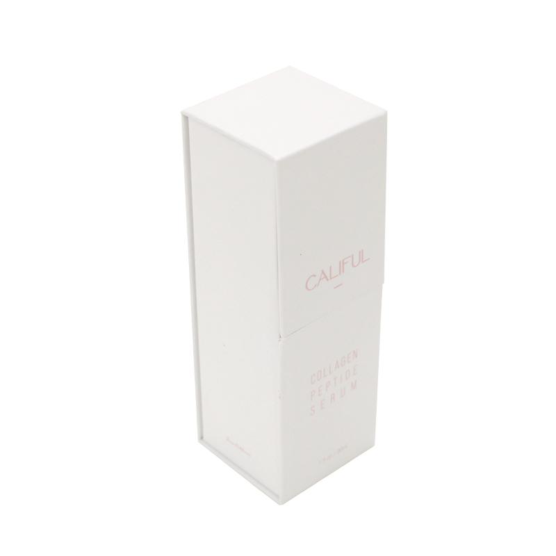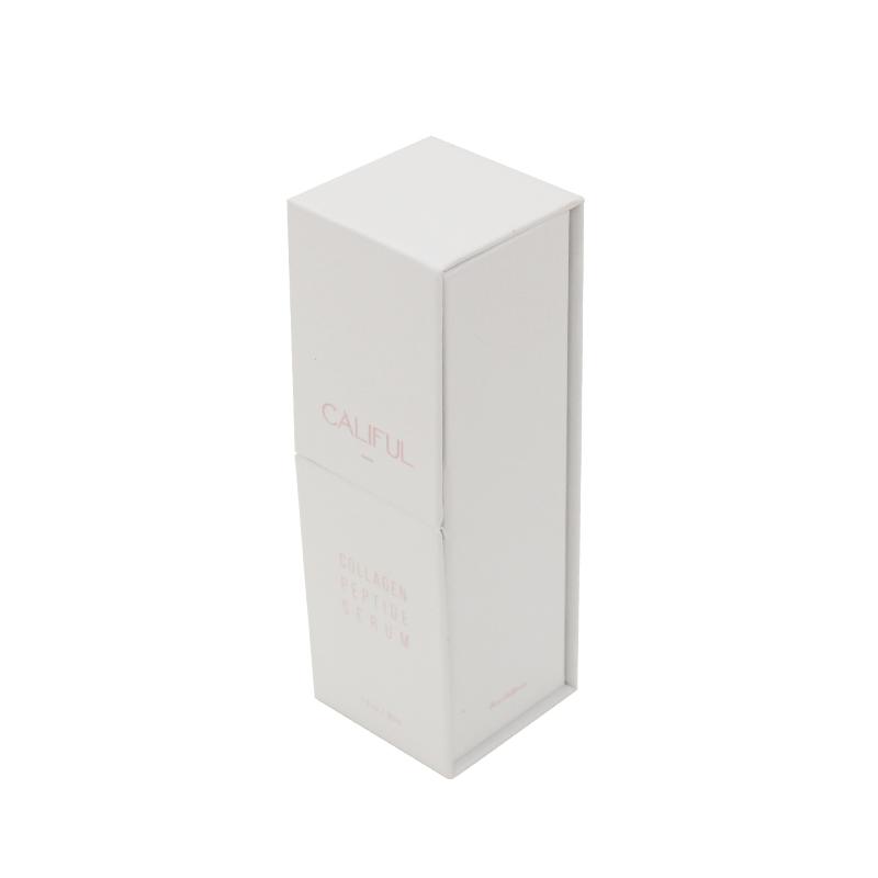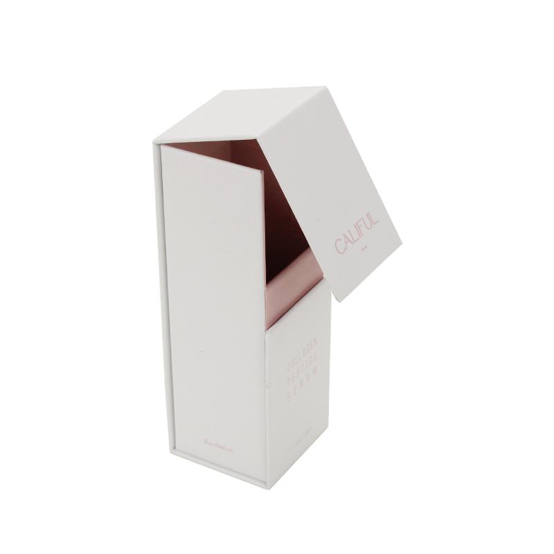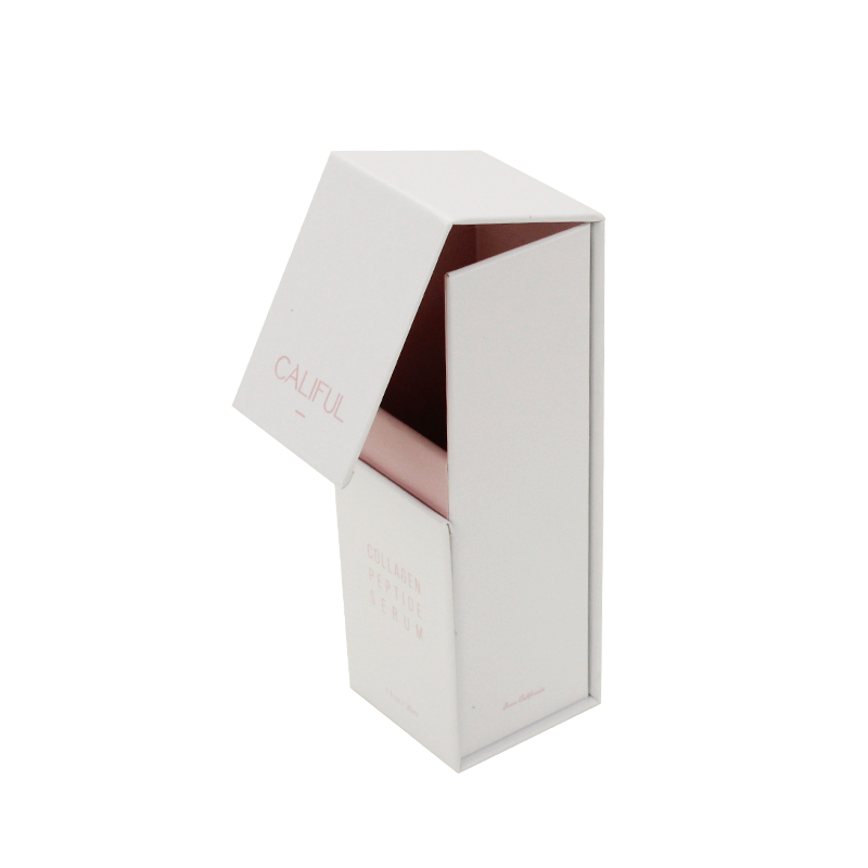 Dit is een kleine staande magnetische doos wat maakte van 157g kunstdrukpapier + 1200g grijs karton, buitenkant bekleed met mat wit en aan de binnenkant bevestigd met roze karton.
