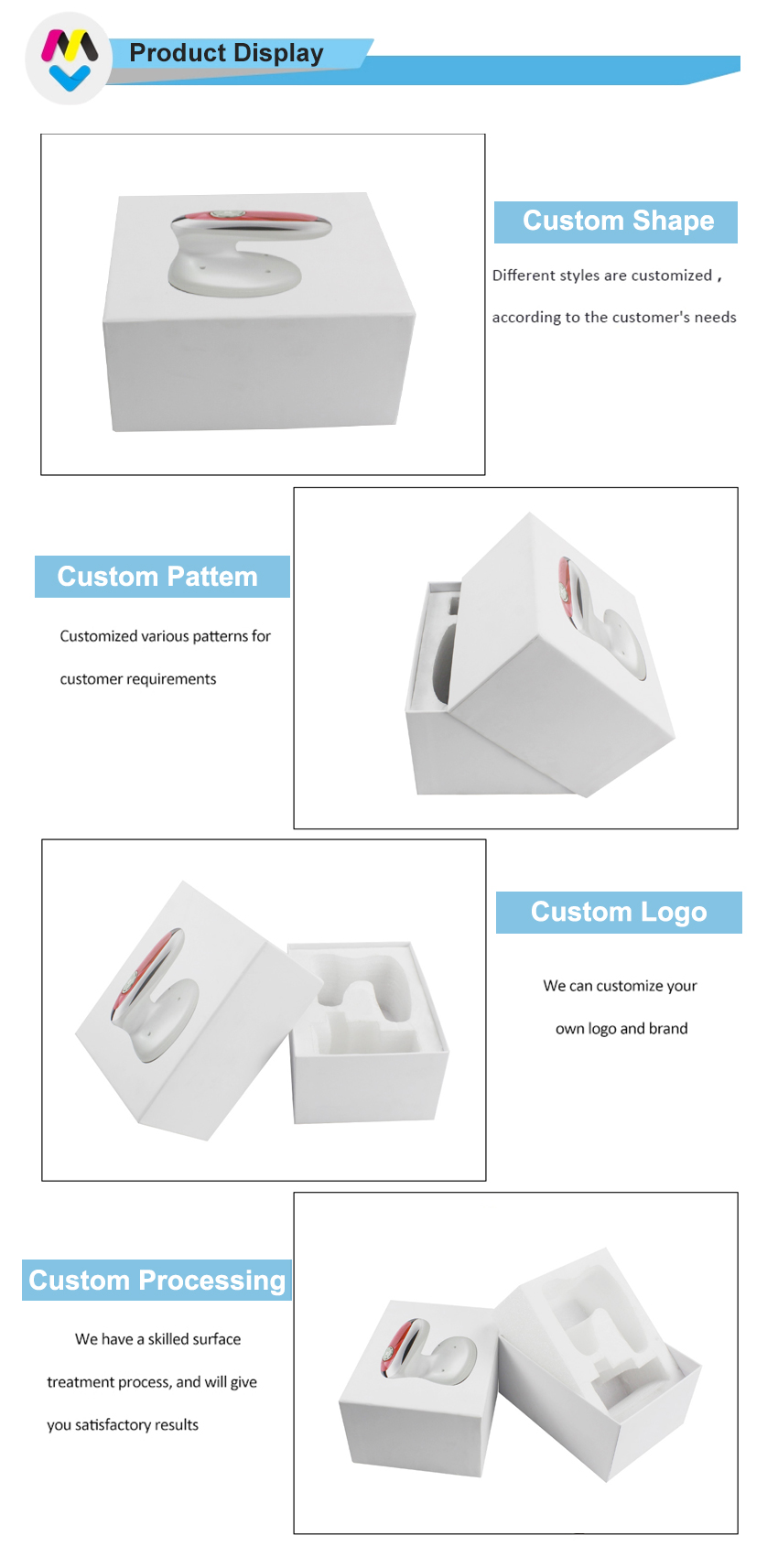 Dit is een boven- en onderdoos wat maakte bestaande uit 157g C2S-kunstdrukpapier + 1200g grijs karton, zitten er witte PE-schuim van goede kwaliteit op de bodem van de doos. Het gezichtsinstrument past perfect in het PE-schuim.