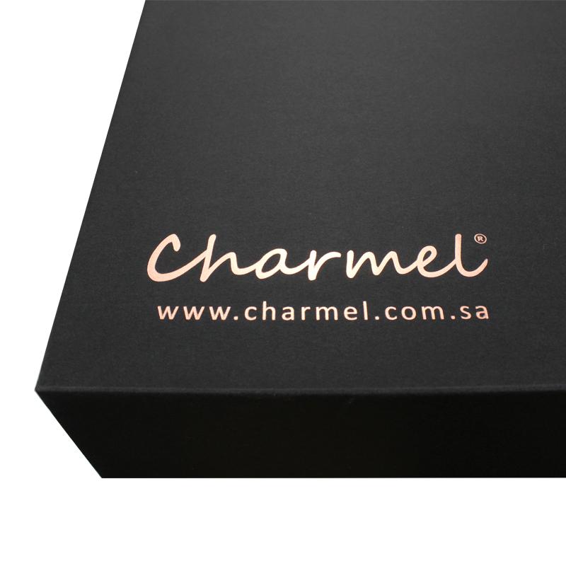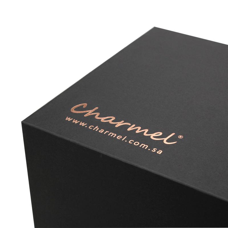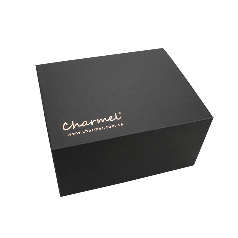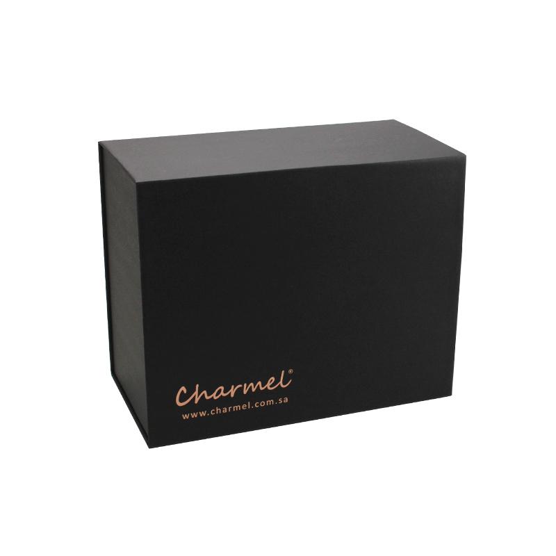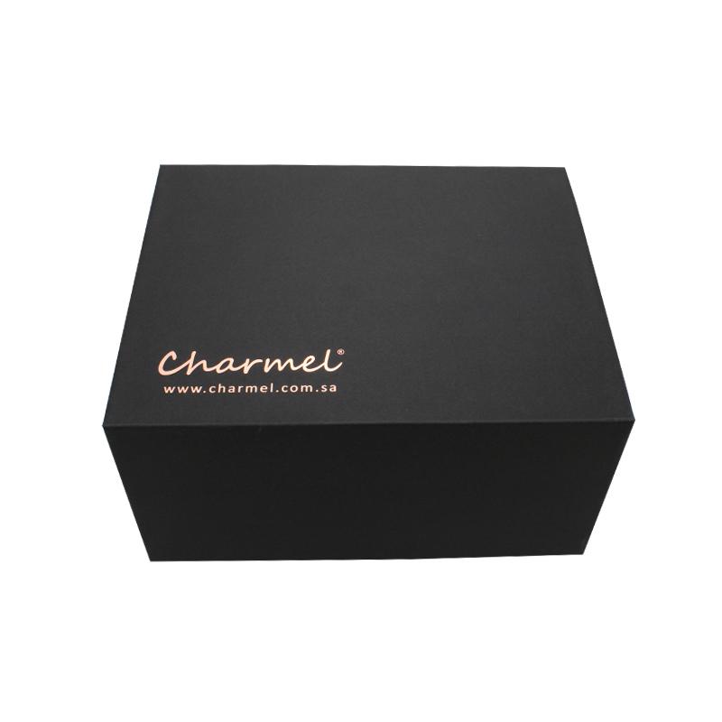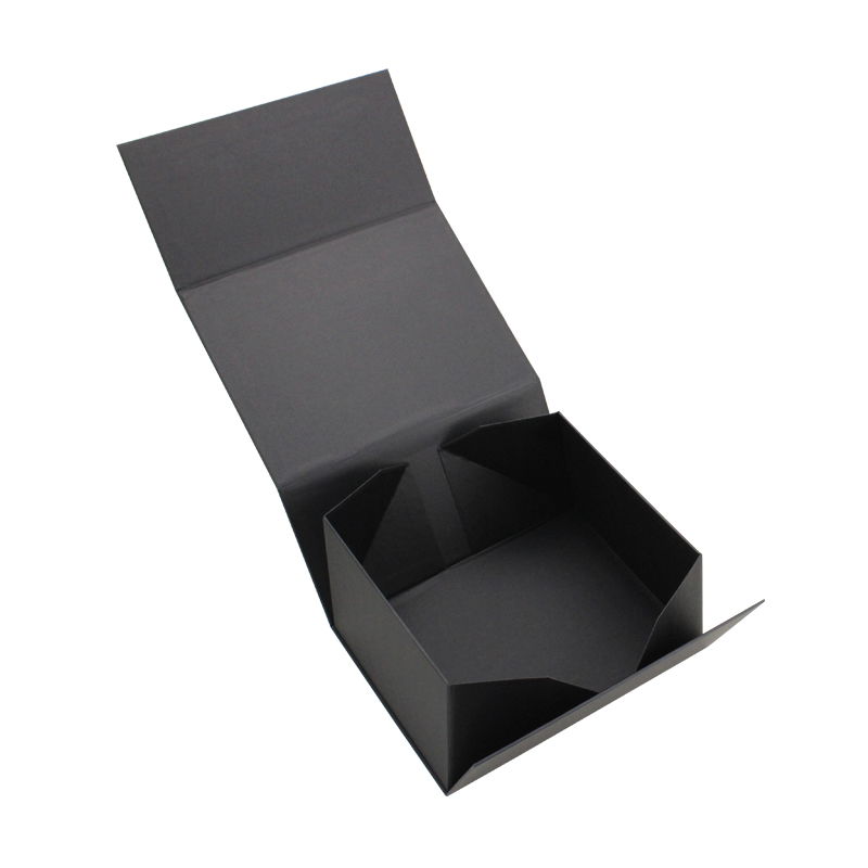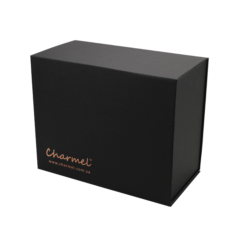 Dit is een zwarte opvouwbare magnetische verpakkingsdozen wat maakte van speciaal zwart papier en 1200g grijs karton, het logo op de hoek van de bovenste deksel is voorzien van roségouden foliedruk. We kunnen de maat en het logo aanpassen aan uw wensen.