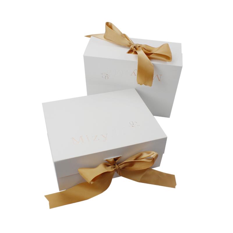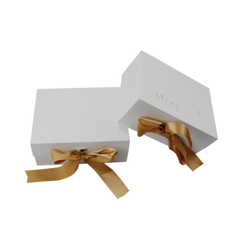 Dit is een witte magnetische geschenkdozen wat maakte van speciaal papier en 1200g grijs karton, logo in goudfolie gestempeld en in reliëf aangebracht op de buitenkant van de doos en het bijgevoegde lint sluit in dezelfde kleur als het logo, effen wit zonder opdruk aan de binnenkant van de doos. We kunnen het formaat aanpassen aan uw wensen.