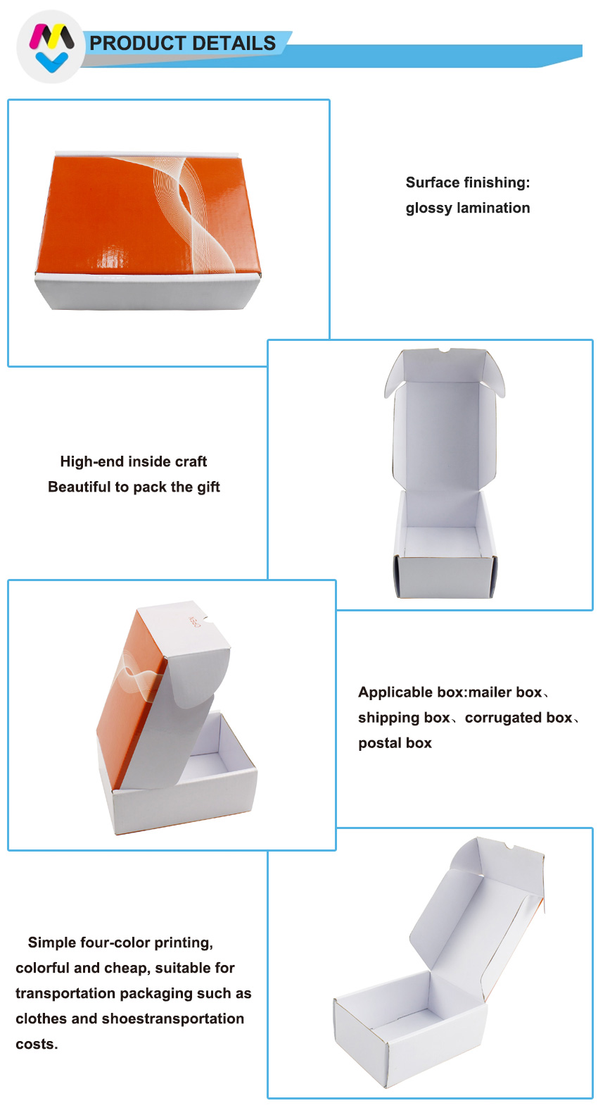 Dit is een glanzende gegolfde geschenkdozen Gemaakt van 300g CCNB+WE fluit, zijn het gegolfde geschenkdozen voor op maat gemaakte groothandel: de buitenkant is full colour bedrukt met een glanzende oppervlakteafwerking en de binnenkant is effen wit zonder opdruk.
