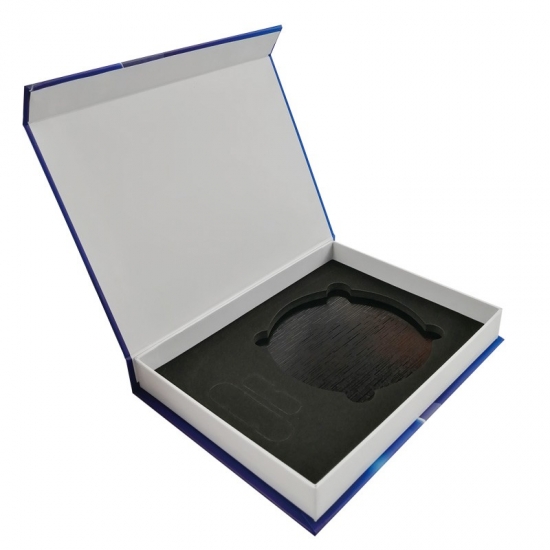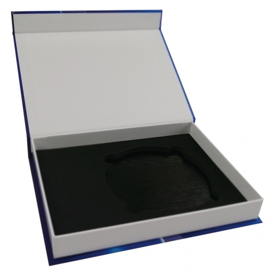 Dit is een magnetische baby-herinneringsdoos wat maakte van 157g C2S-kunstdrukpapier + 2mm grijs karton, buitenkant van de doos vol met opdruk in blauwe kleurverloop, binnenkant van de doos effen wit en het EVA dat naar wens kan worden vormgegeven.