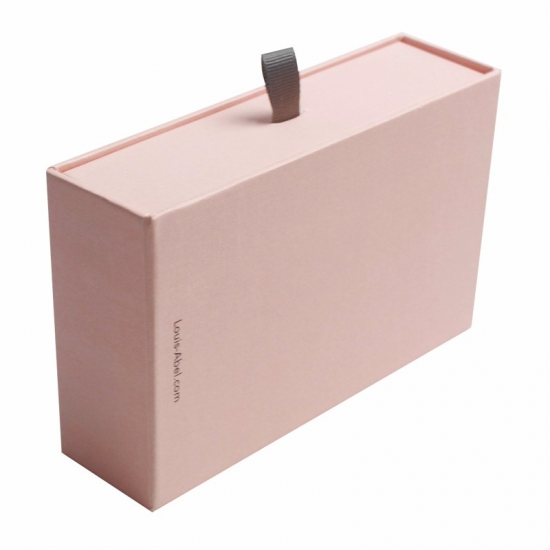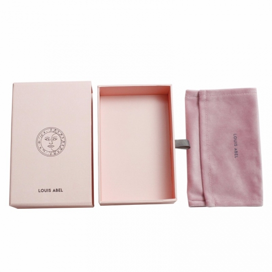 Op maat gemaakte roze sieradendoos met lade en zakje, het is een soort schuifgeschenkverpakking.