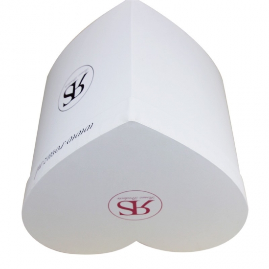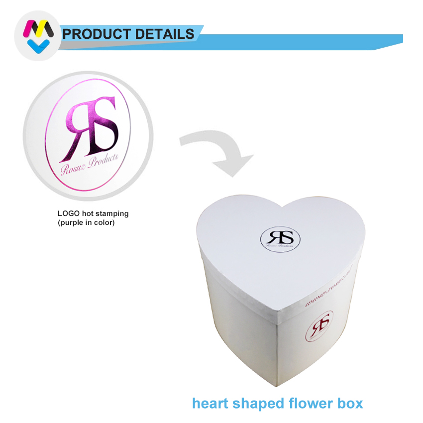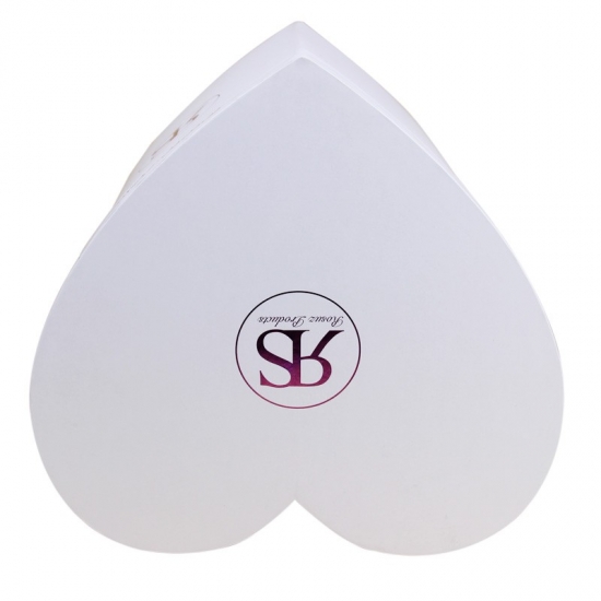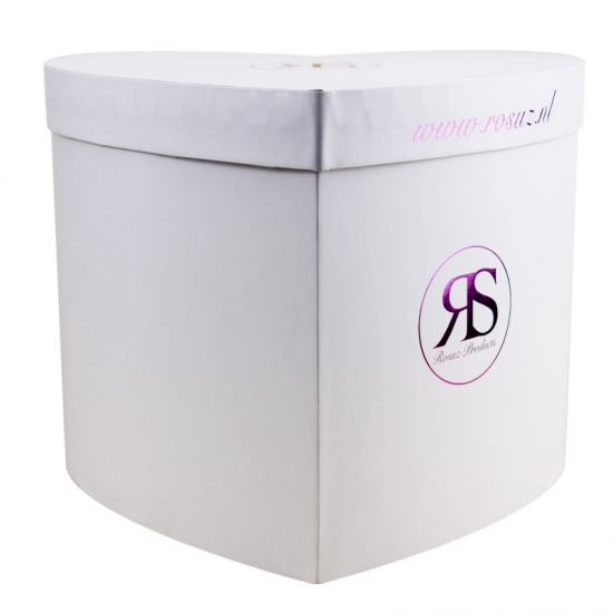 Dit is een op maat gemaakte grote hartvormige, effen witte bloemengeschenkdoos met deksel en bodem gemaakt van 157g C2S kunstpapier + 1200g grijs karton Gebruik paarsgouden foliedruk voor het LOGO op de bovenkant van het deksel.