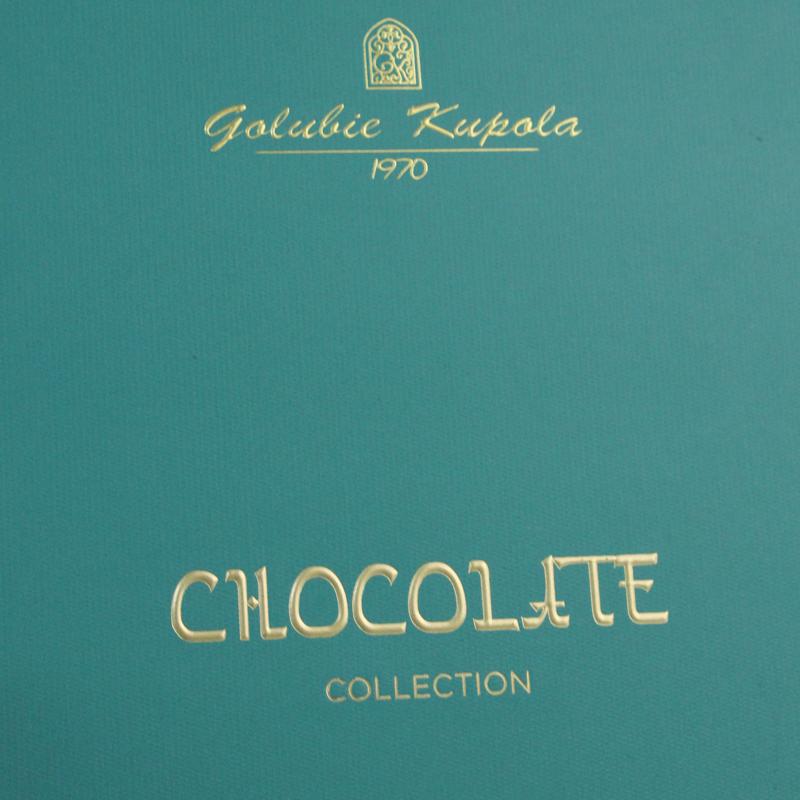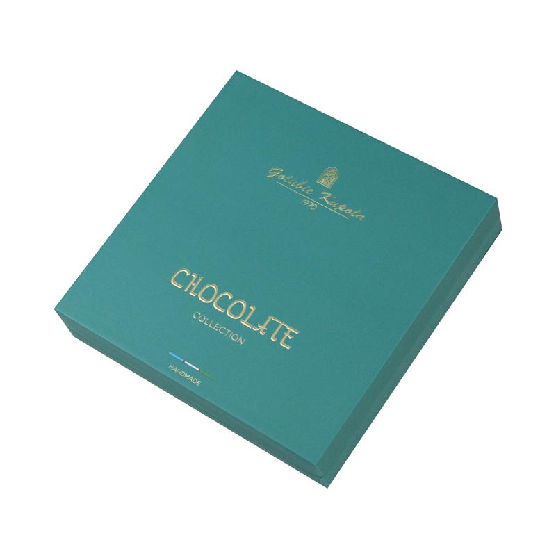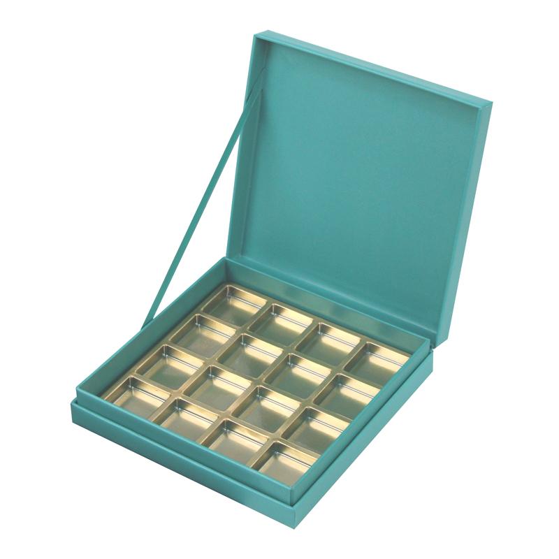 doos materiaal: 120 g/m² groen speciaal papier + 2 mm grijs spaanplaat + blisterinleg + zwart chocoladepapier