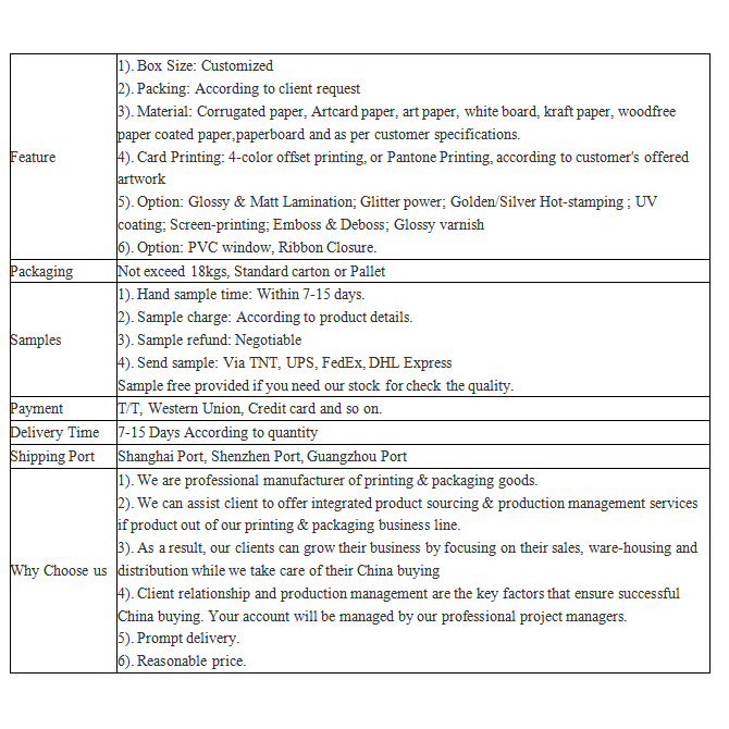 Opmerking: alle productfoto's die we op onze website hebben geplaatst, dienen slechts ter referentie om aan te geven wat voor soort verpakkingen we kunnen maken. Het betekent niet dat we dezelfde producten als op voorraad verkopen. We richten ons op maatwerk in elke maat/kleur, opdruk/structuur van papieren verpakkingen, enzovoort.
