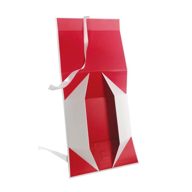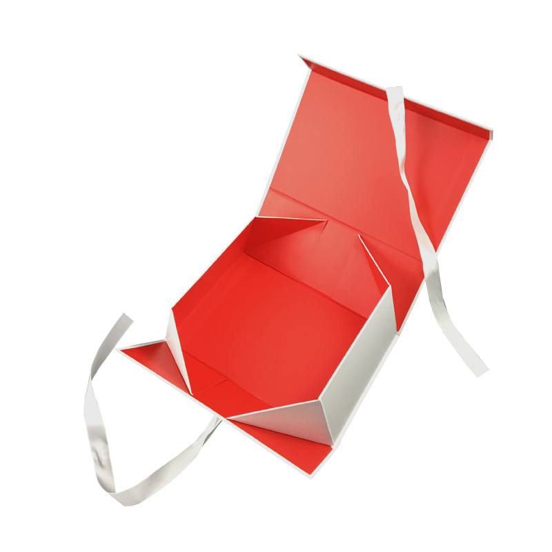 Dit is een witte opvouwbare geschenkdoos met lint met foliedruk aan de buitenkant en de binnenkant is rood, zodat uw verpakking niet langer eentonig is