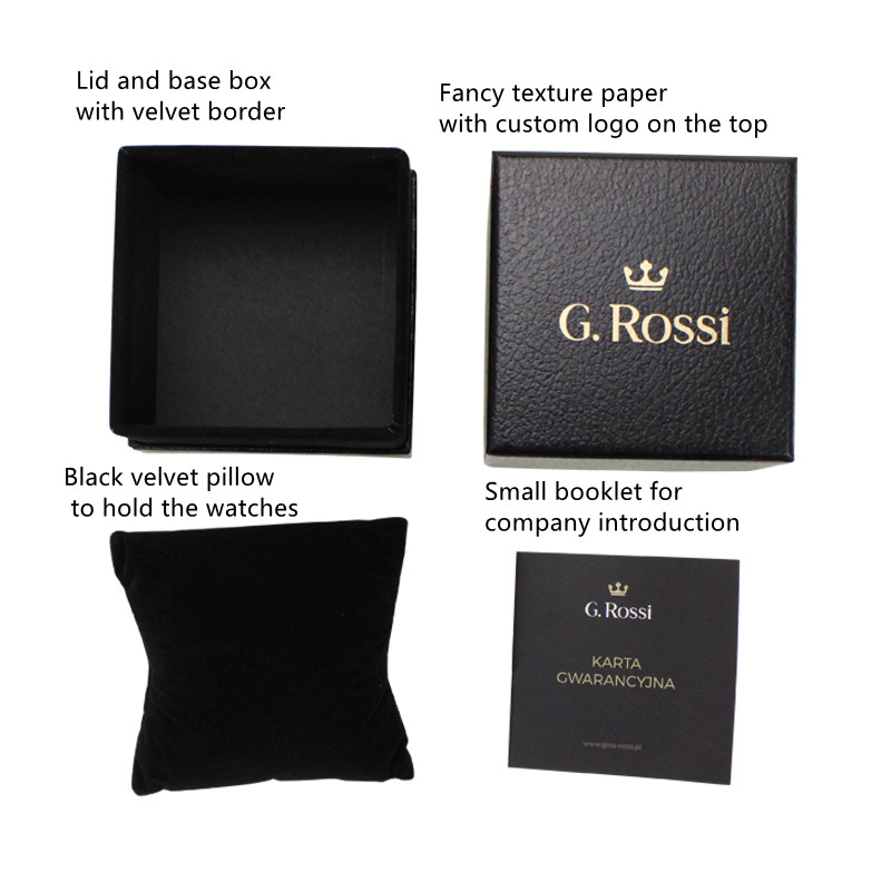 doos materiaal: 120 grams zwart imitatiepapier gemonteerd op 1000 grams stevig karton met zwart karton aan de binnenkant, een dun stuk schuim aan de bovenkant en zwart fluweel gemonteerd op de schouder.