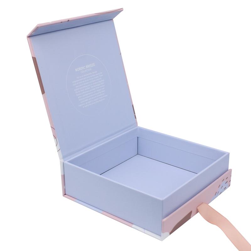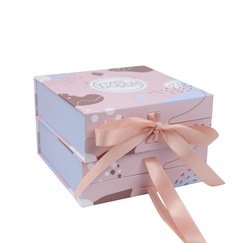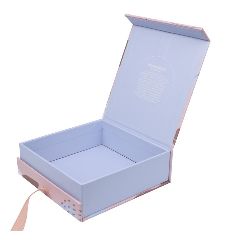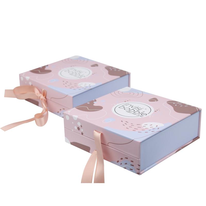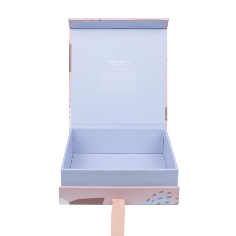 Mooi ontworpen luxe doos met lintsluiting, gemaakt van 2 mm dik spaanplaat. De sluiting met lint zorgt ervoor dat de verpakking verrassend snel opengaat. De roze en blauwe opdruk en matte afwerking zorgen voor een elegante en consistente uitstraling.
