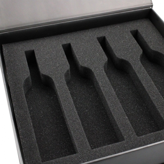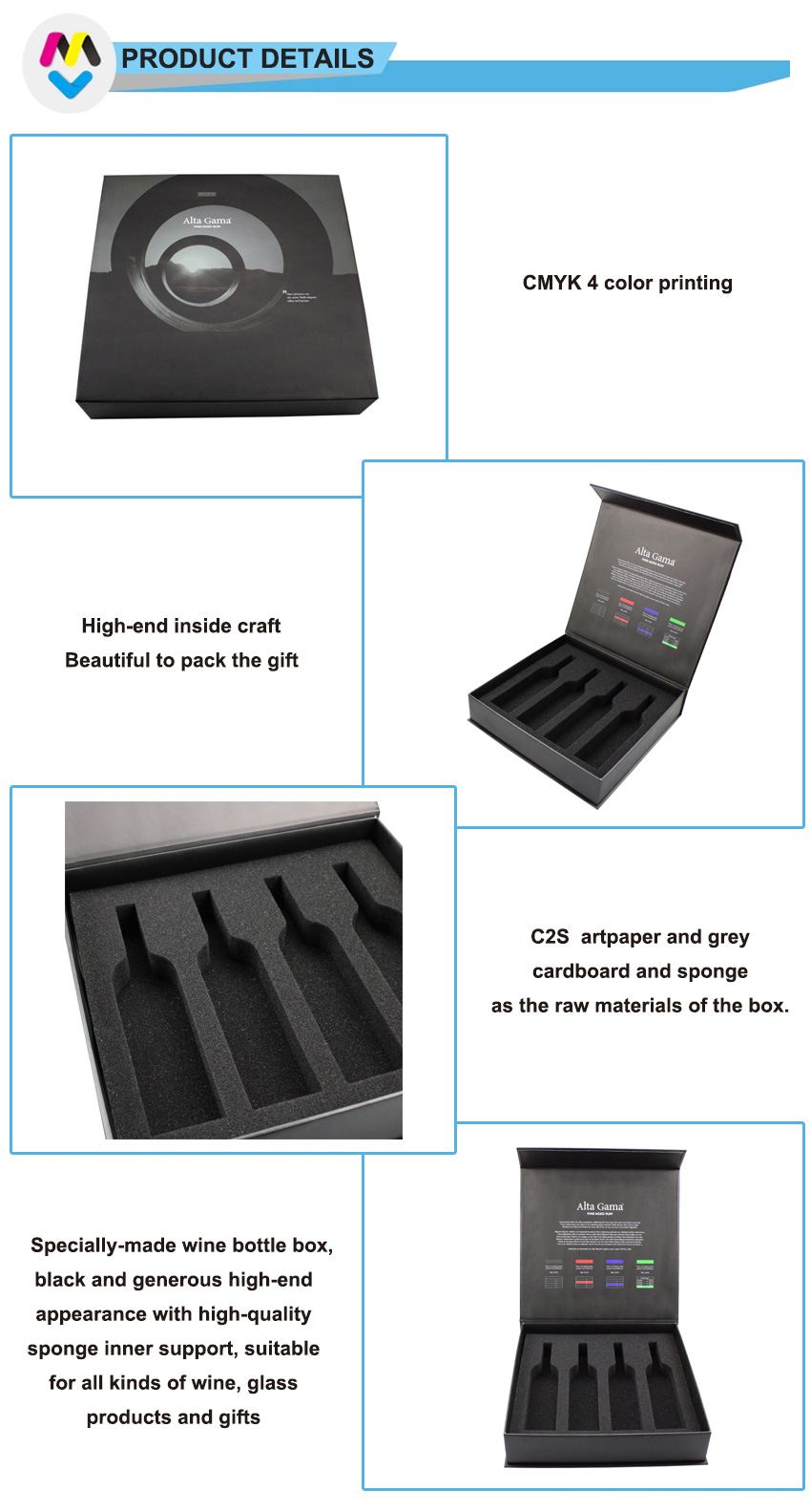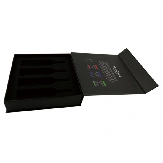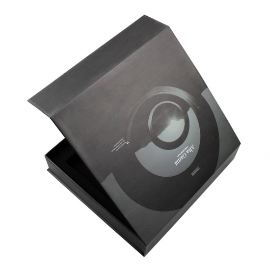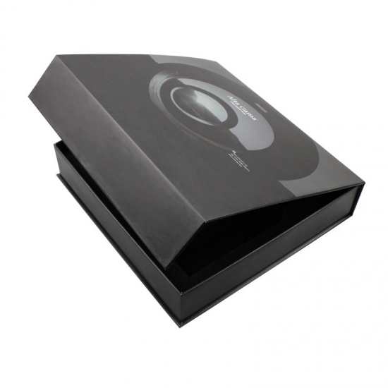 zwarte magnetische doos is gemaakt van 157gsm C2S kunstpapier gelamineerd met 2 mm grijs karton en binnenin gebruik sponsschuim, het is een zeer magnetische opvouwbare cadeaudoos-stijl, met zwarte opdruk en matte laminering