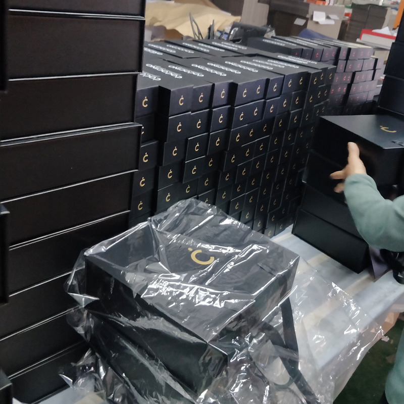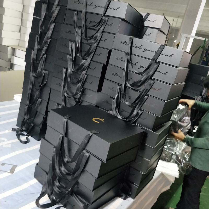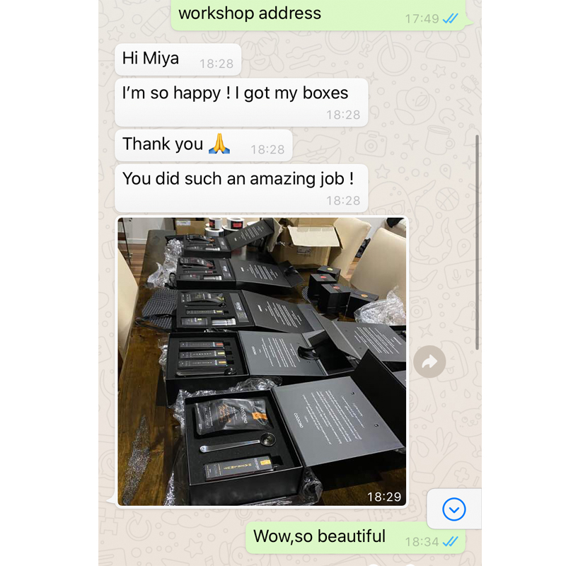Volgens haar wensen zullen we het logo met goudfolie stempelen en reliëf aanbrengen, zodat het logo schittert en indruk maakt op de klanten. Nadat we het ontwerp voor de magnetische geschenkdoos hebben afgerond, beginnen we het abstracte ontwerp om te zetten in een concreet product. Toen ze onze samples zag, was ze ervan overtuigd dat we aan haar verpakkingseisen hadden voldaan. Ze bevestigde de bestelling snel en startte de productie.