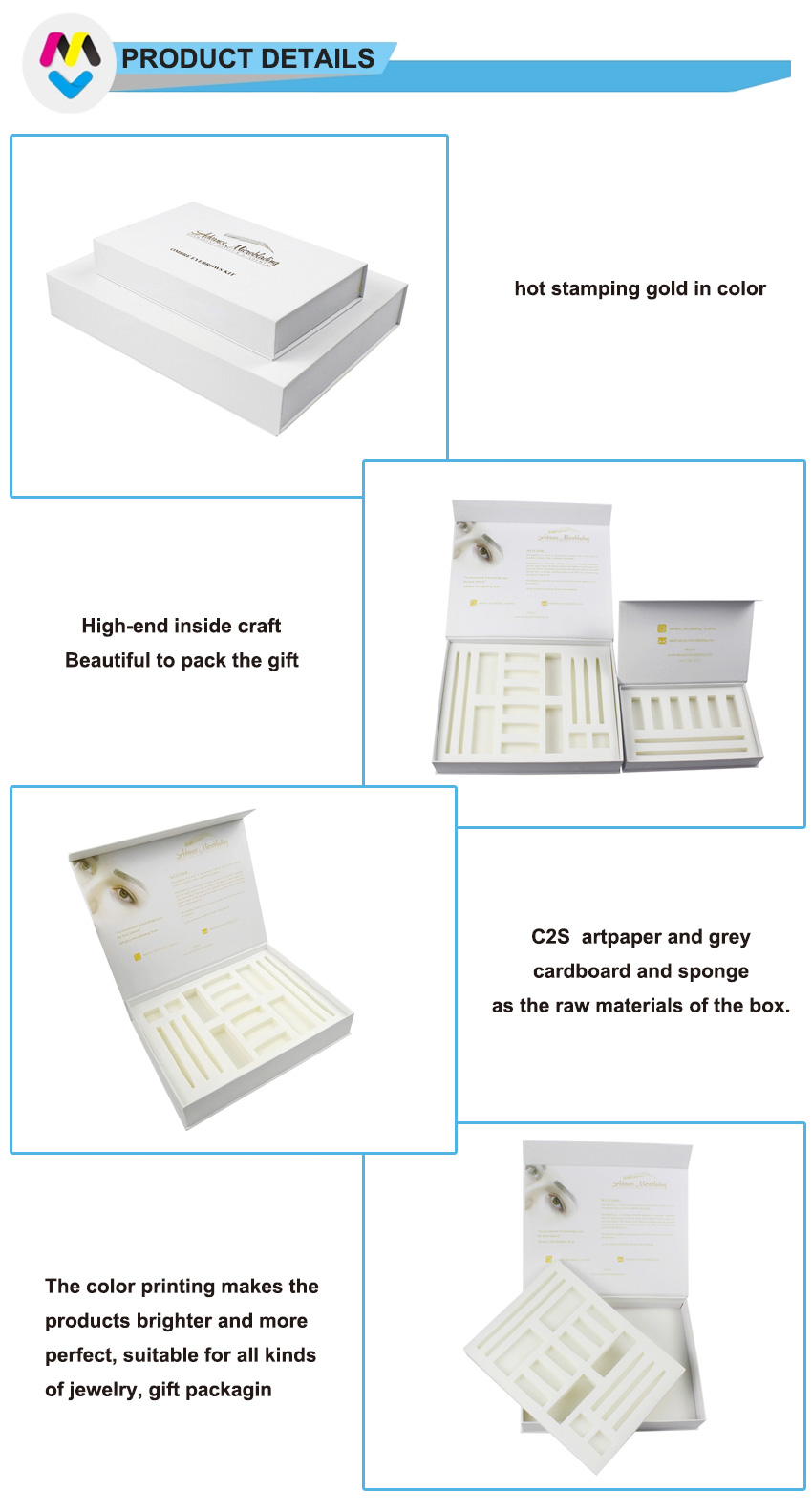Dit is een verpakkingsdoos met verdelers wat maakte van 157g C2S-kunstdrukpapier + 2 mm grijs karton, het logo bovenop de doos is een gemengde kleurenfolie-stempeling, waardoor de doos er glanzend en luxe uitziet, de binnenkant van de doos is voorzien van op maat gemaakte witte spons met fluweel.