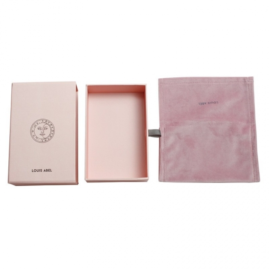 Dit is een roze sieradenladekast wat maakte Gemaakt van speciaal papier en 1200g grijs karton. De binnenkant van de doos is voorzien van een op maat gemaakt zakje met zeefdruk en een zwart logo. Het is een soort schuifgeschenkverpakking.