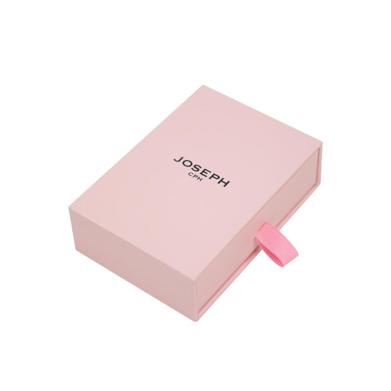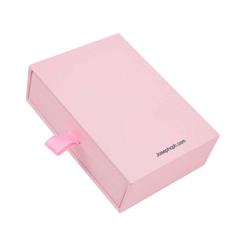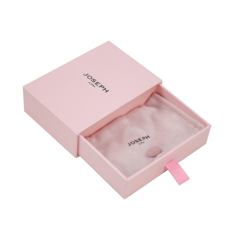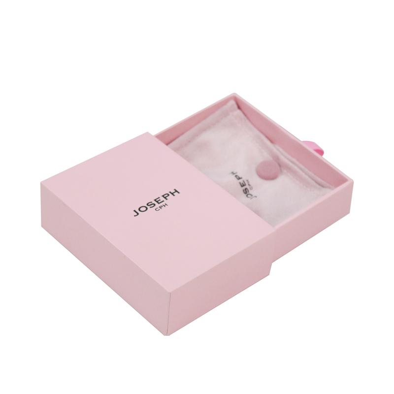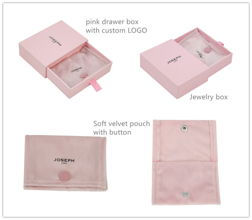 Het is een sieraden lade doos wat maakte door roze speciaal textuurpapier + 2 mm grijs karton ,vol met roze opdruk op de voor- en achterkant met logo en tekst, goede kwaliteit fluwelen zakje met hetzelfde logo als de doos.