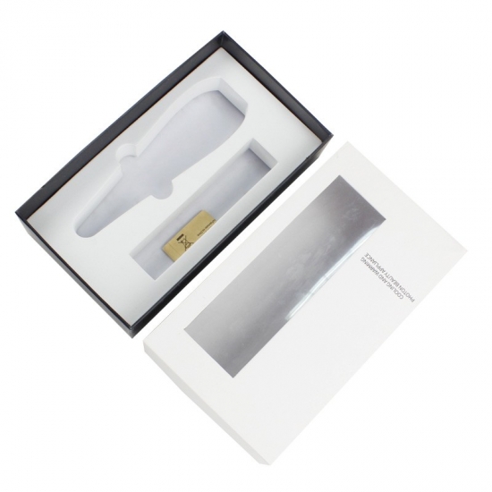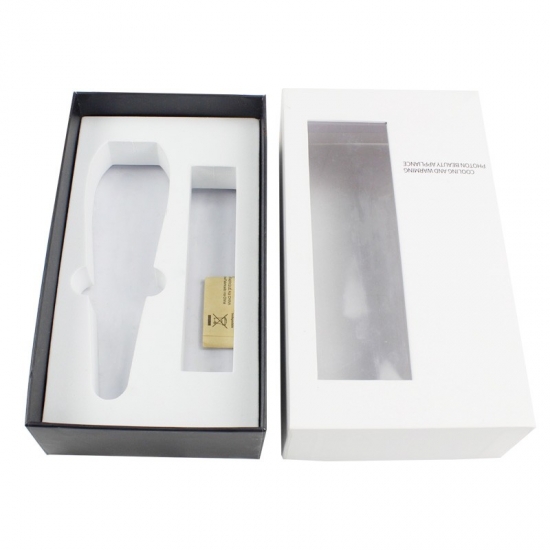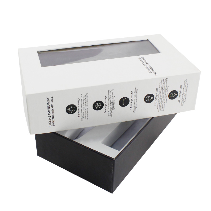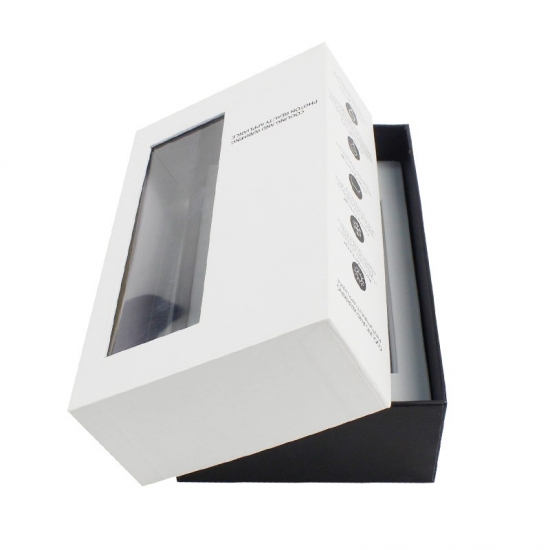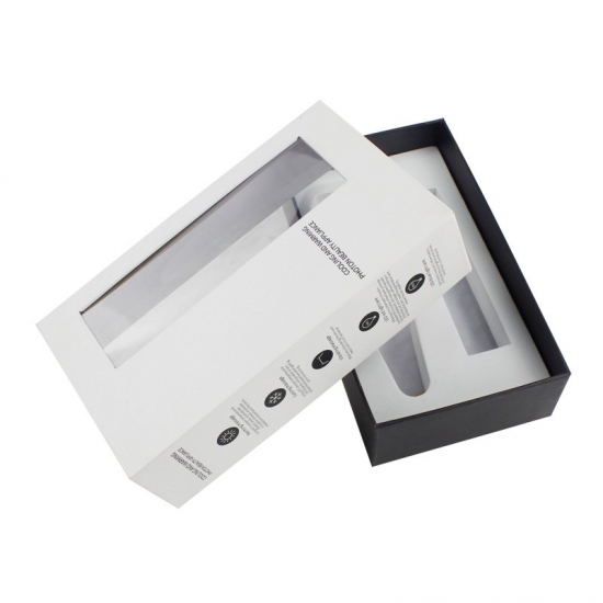 Dit is een geschenkdozen met deksels wat maakte van 157g C2S-kunstdrukpapier + 1200g grijs karton, wit deksel met PVC-venster en zwarte basis met aangepaste tekst op de doos, wit EVA-schuim is aangepast aan de vorm van het product.