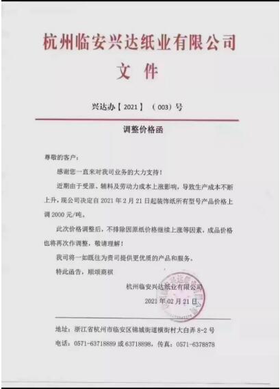 Op 21 februari publiceerde Hangzhou Lin'an Xingda Paper Co., Ltd. een prijsverhogingsbrief waarin stond dat de productiekosten zijn gestegen als gevolg van de stijging van de grondstoffen, hulpstoffen en arbeidskosten. Het bedrijf zal de prijzen van alle soorten decoratieve producten verhogen.