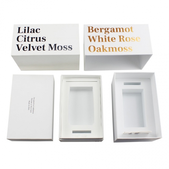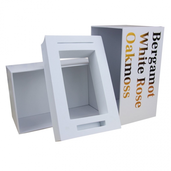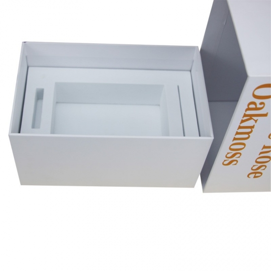 Dit is een witte kaarsendoos met deksel wat maakte van 157g C2S-kunstdrukpapier + 1200g grijs karton, vol tekst aan één zijde met gouden foliedruk, op maat gemaakt EVA-schuim kan naar wens worden gevormd.