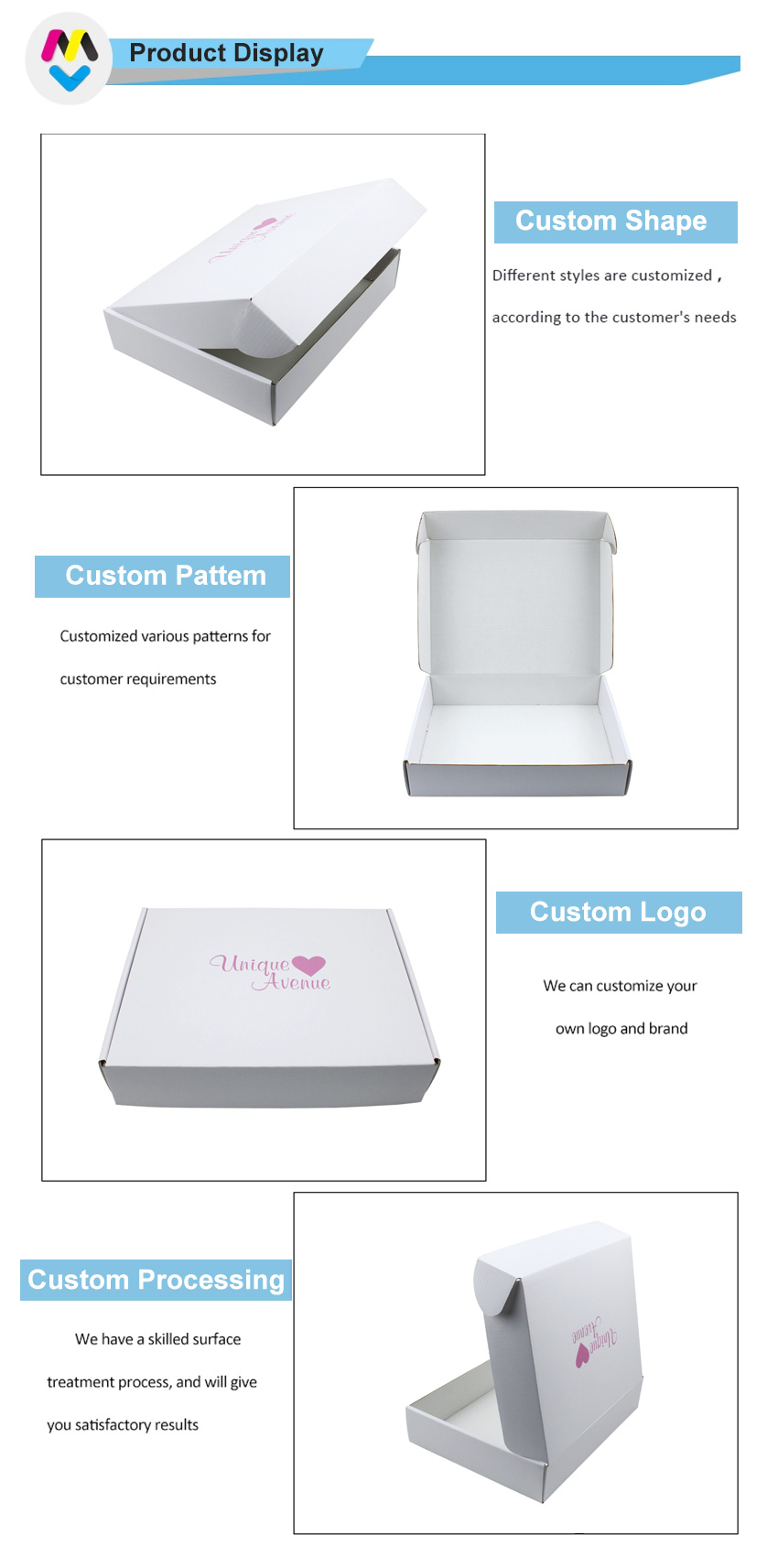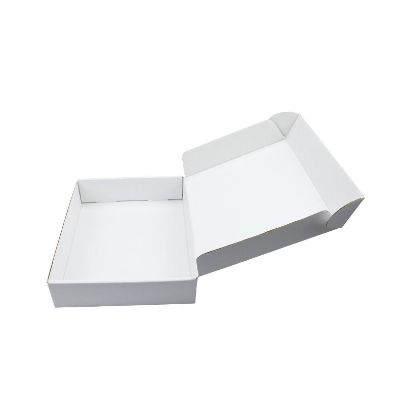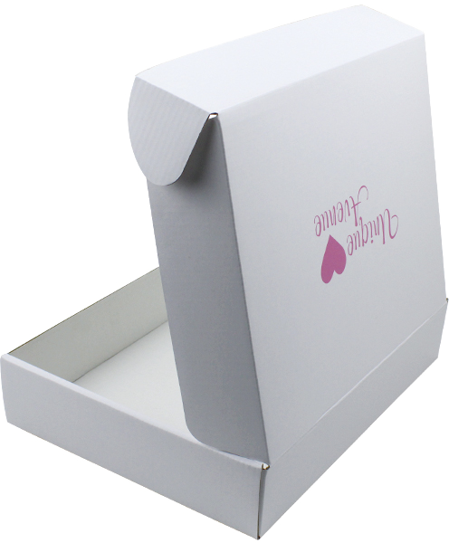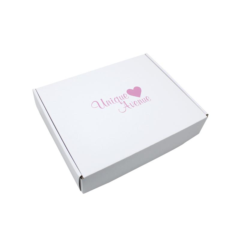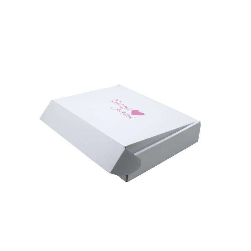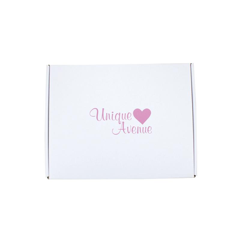 Dit is een witte 3-laags golfkartonnen doos die gemaakt is van 300g CCNB+WE golfkarton. Het is geschikt om postdozen plat in te pakken. Het logo is in roze kleur gedrukt in het midden van de bovenkant van de doos.