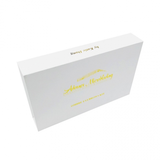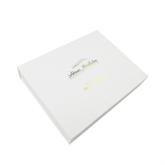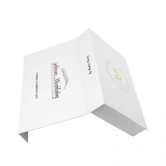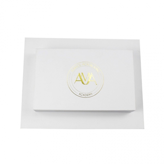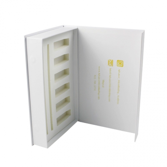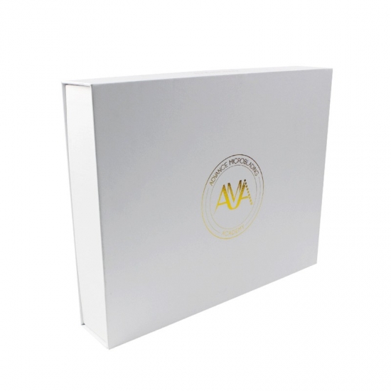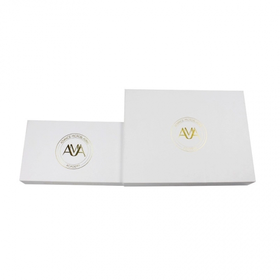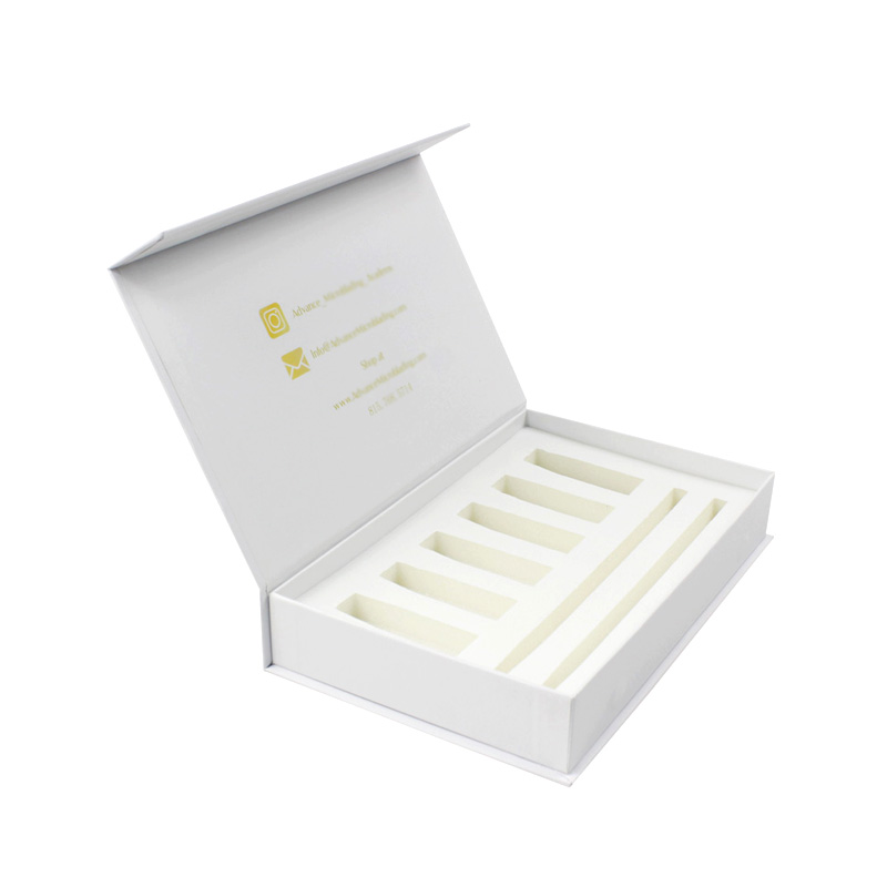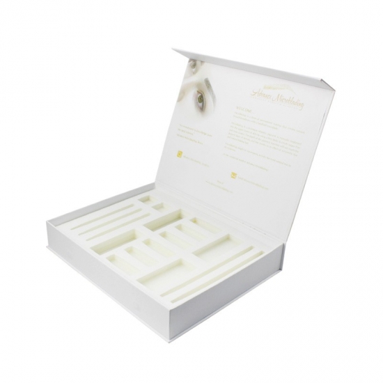 Dit is een op maat gemaakt wit magnetische doos wat maakte van 157g C2S-kunstdrukpapier + 2 mm grijs karton, het logo aan de buitenkant van de doos is een gouden foliedruk, waardoor de doos er glanzend en luxe uitziet, de binnenkant van de doos is voorzien van een op maat gemaakte witte spons met fluweel.