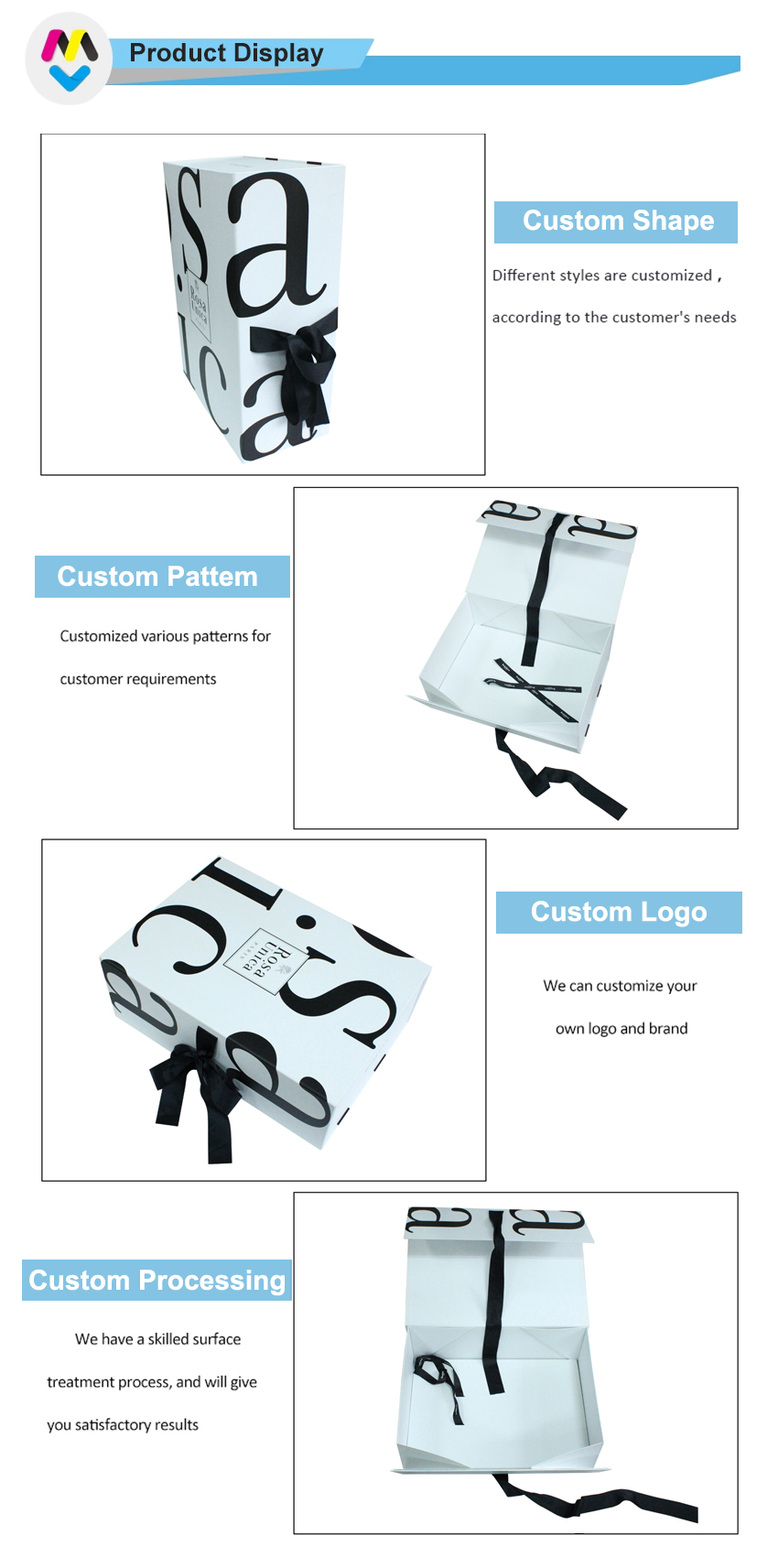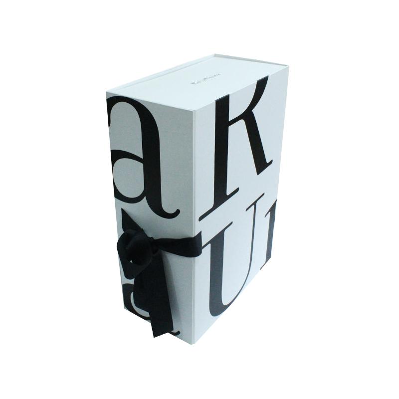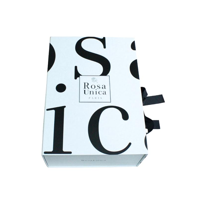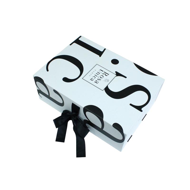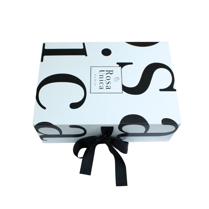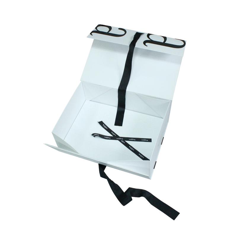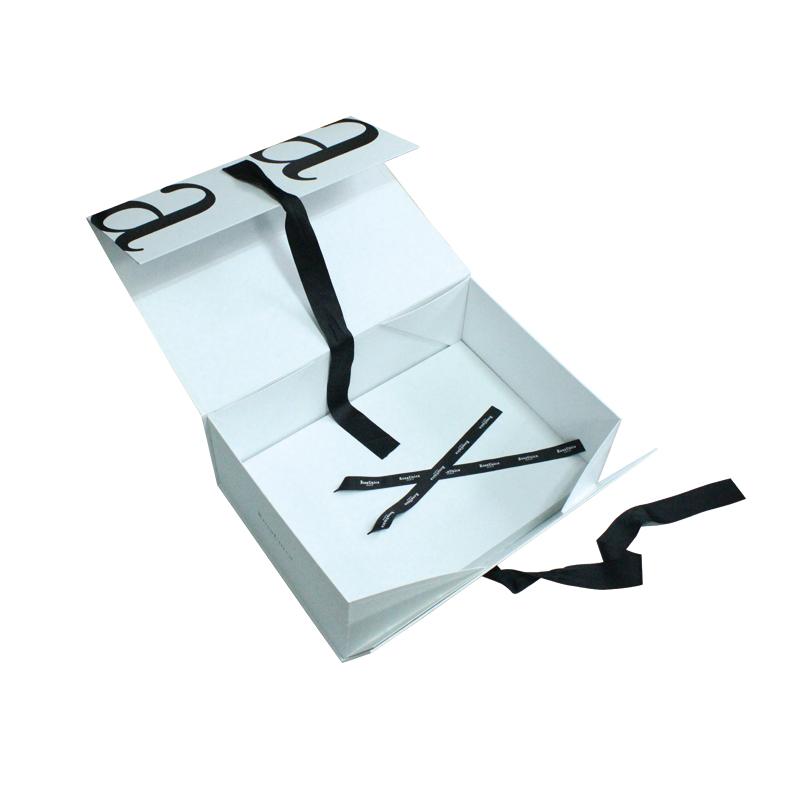 Dit is een grote, witte, opvouwbare geschenkdoos met zwart logo van chipboard, gemaakt door 157g C2S kunstpapier + 1800g sterk grijs karton en de binnendoos heeft een langer lint dat door de vier hoeken van de doos loopt om de doos te versterken, zwart lint dat overeenkomt met de kleur van het logo.