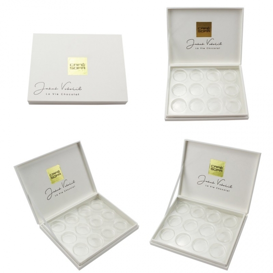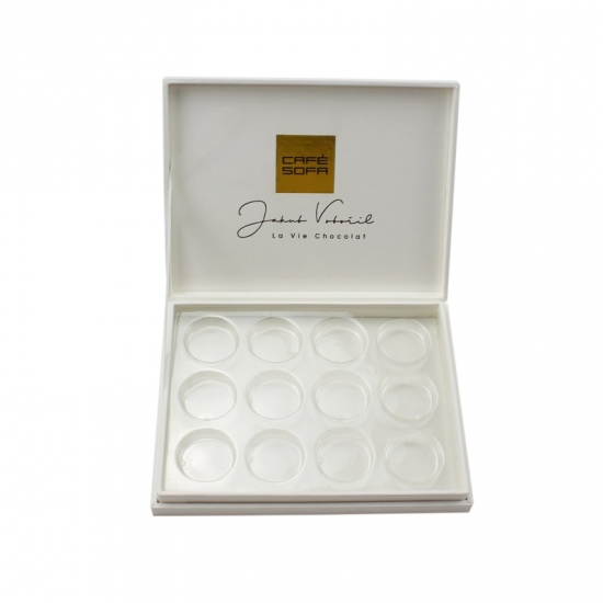 Op maat gemaakte witte chocoladeverpakkingsdoos met kunststof PVC-verdeler, logo in gouden foliedruk op de buitenkant, de binnenzijde van de doos is op maat gemaakt in vele kleine ronde vormen, afhankelijk van de grootte van de chocolaatjes.